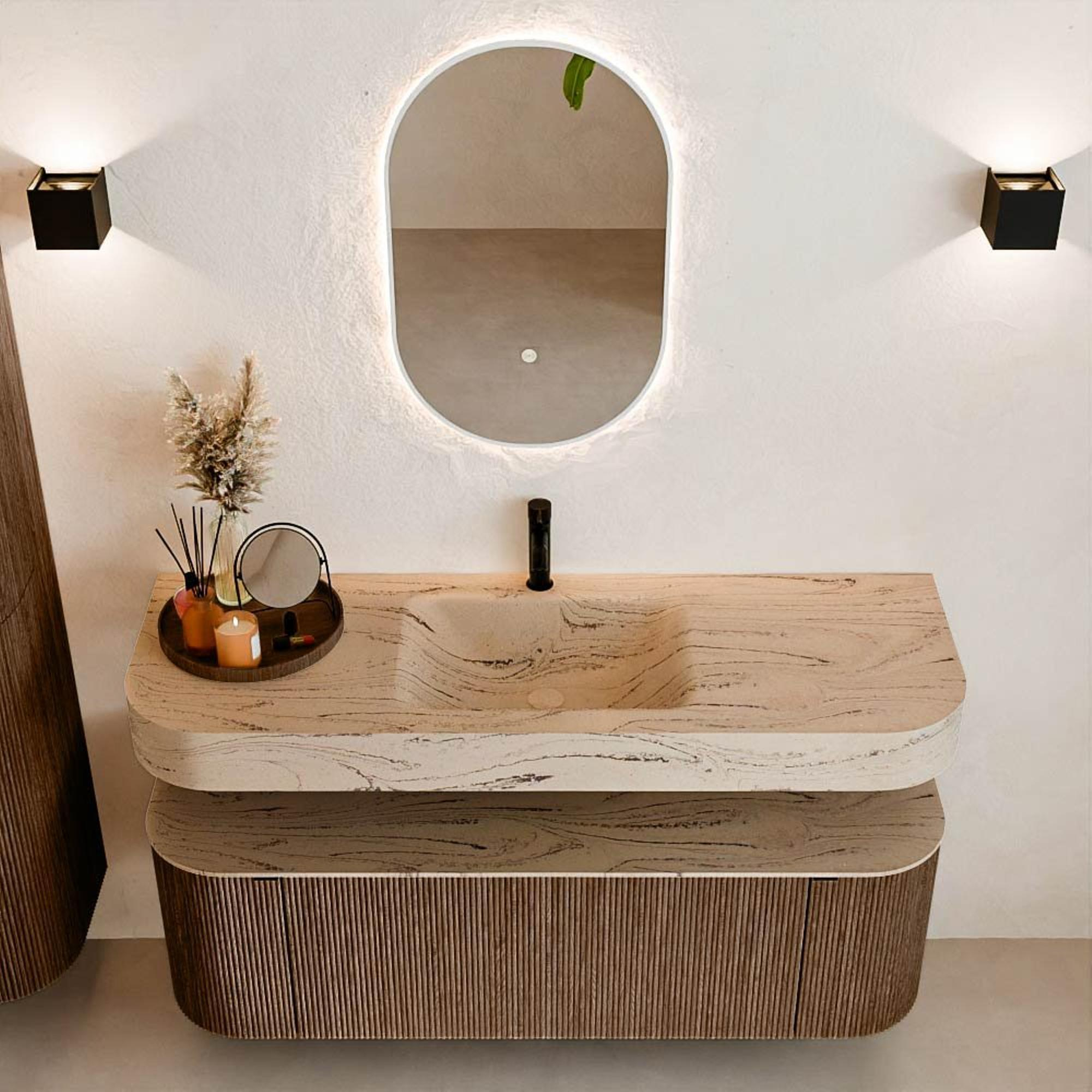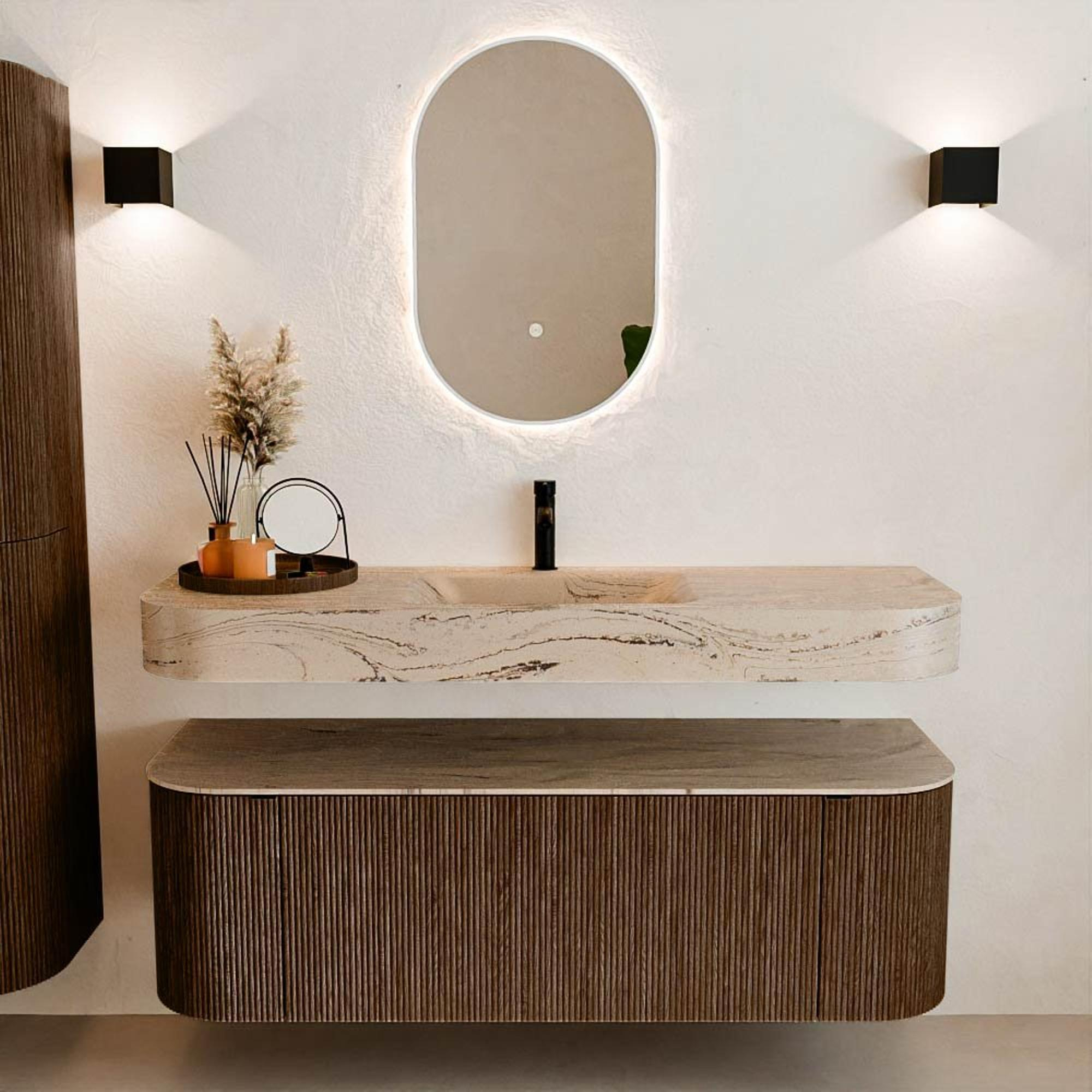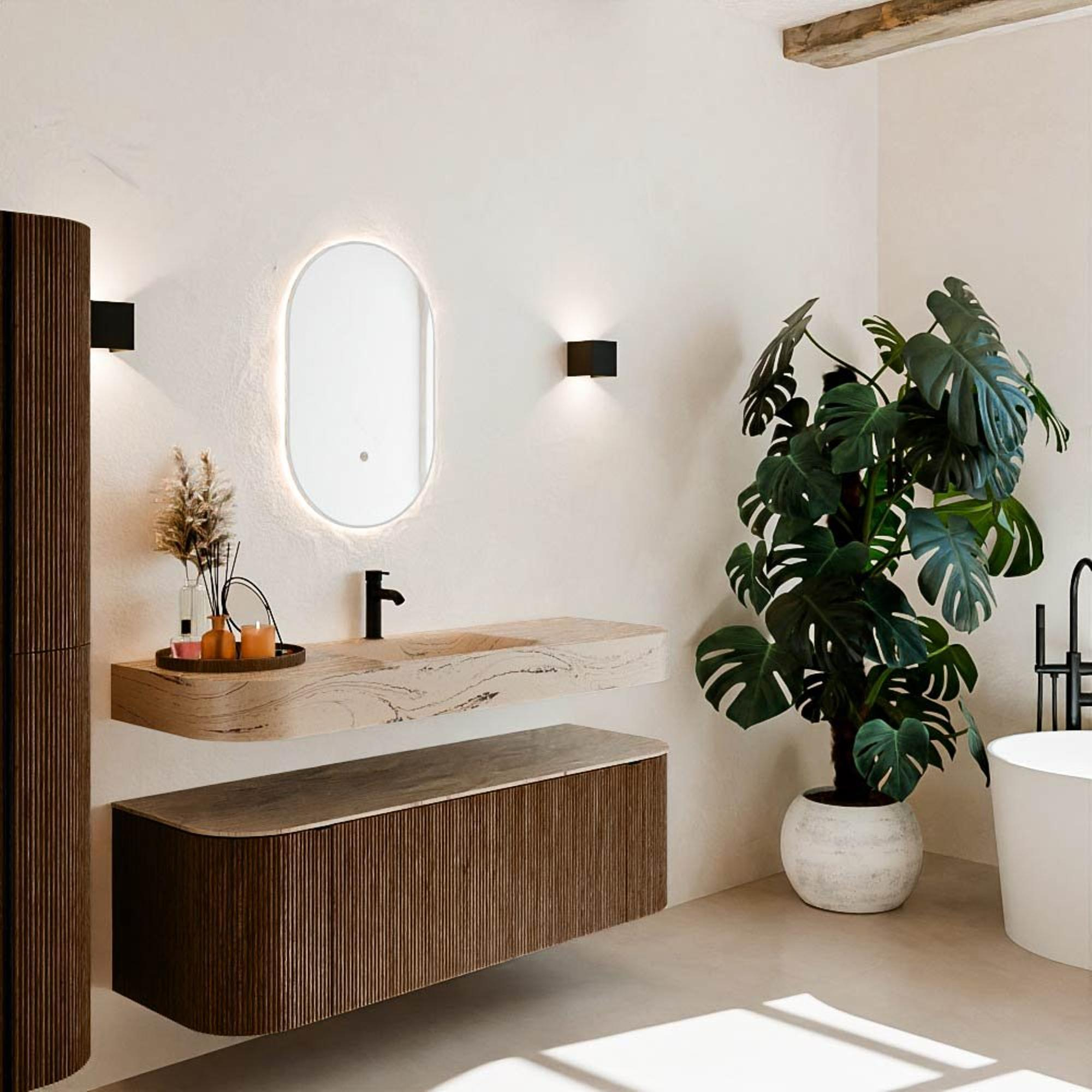 Natuurlijke materialen in warme tinten. De verticale ribbels brengen ritme en textuur in het ontwerp, terwijl het eikenhout zorgt voor een warme, ambachtelijke uitstraling. Kies uit 5 houttinten OAK, WALNUT, DUSK, SHADOW en RUBY zorgvuldig geselecteerde houtkleuren om zowel moderne als klassieke badkamers te verrijken.
