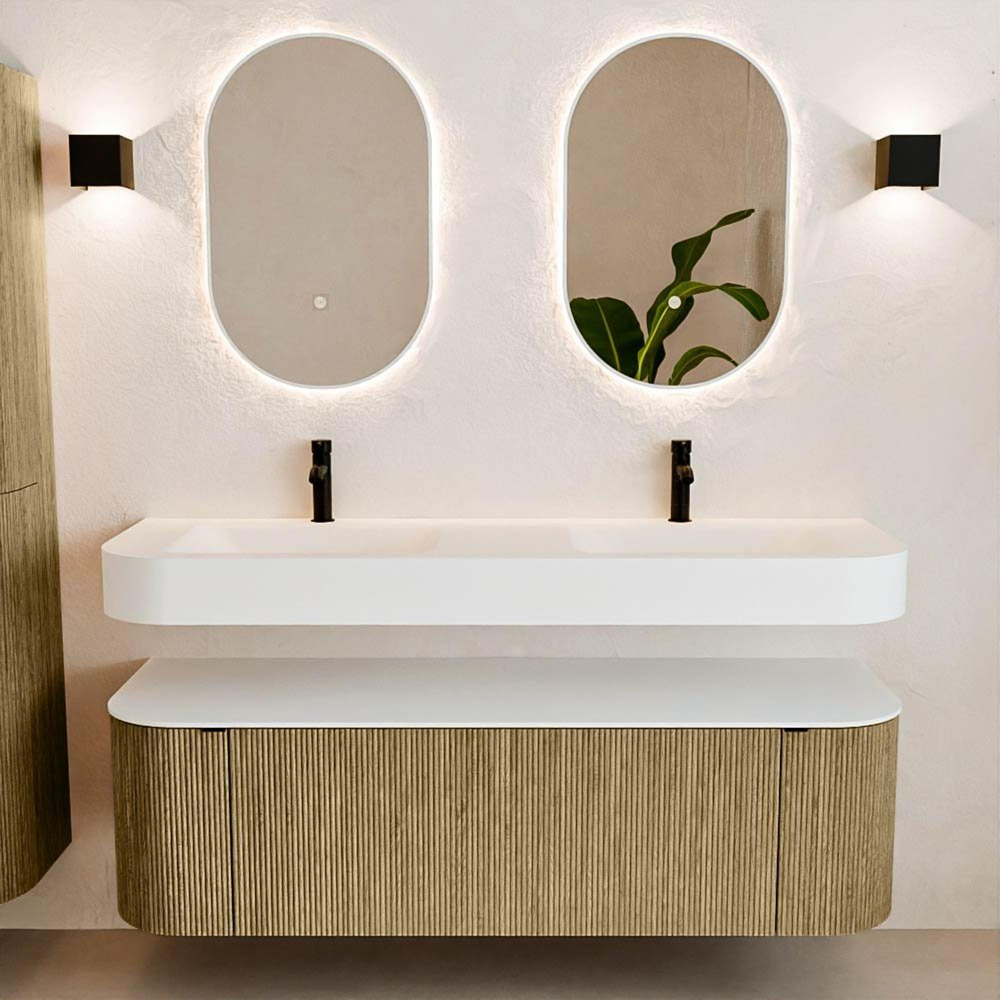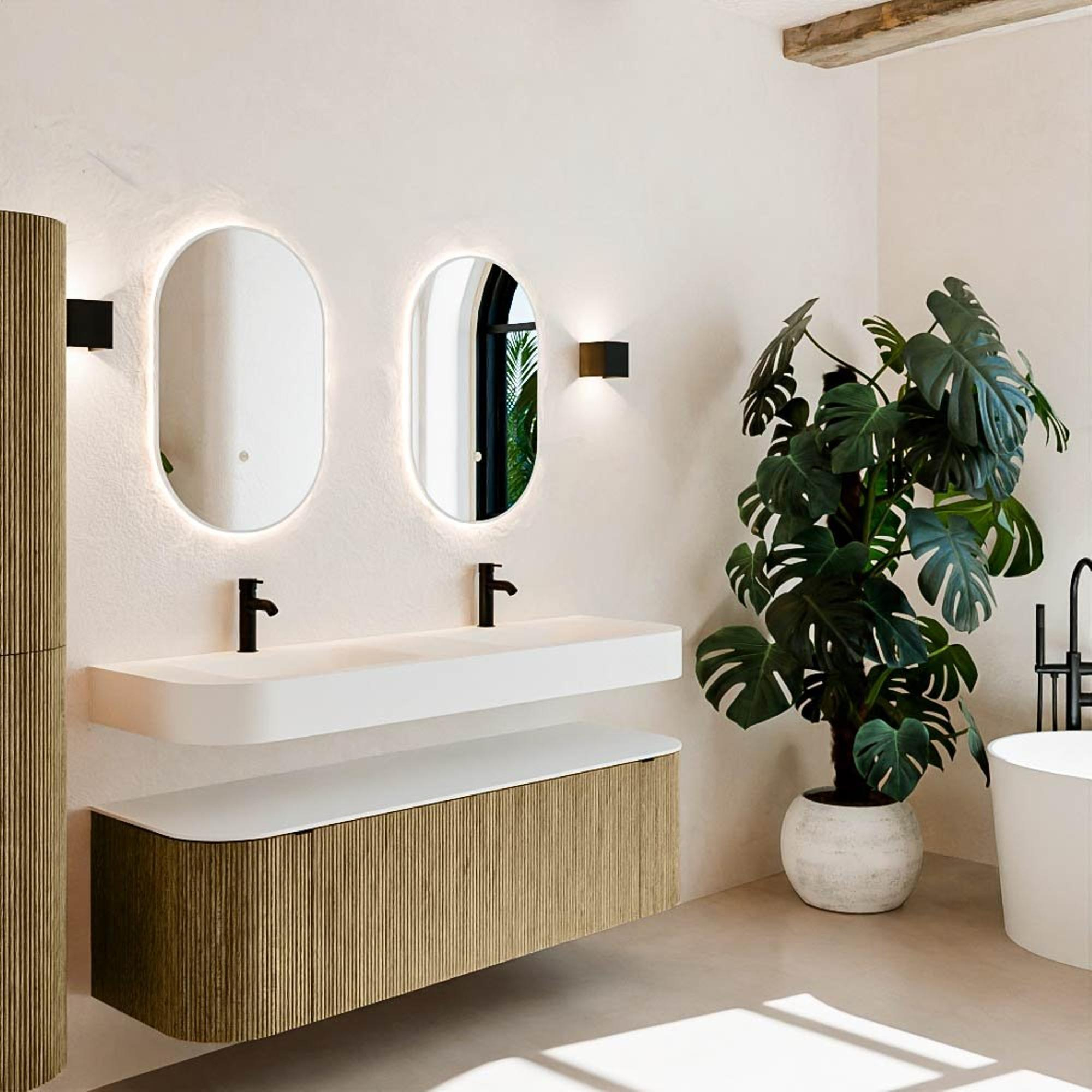 Natuurlijke materialen in warme tinten. De verticale ribbels brengen ritme en textuur in het ontwerp, terwijl het eikenhout zorgt voor een warme, ambachtelijke uitstraling. Kies uit 5 houttinten OAK, WALNUT, DUSK, SHADOW en RUBY zorgvuldig geselecteerde houtkleuren om zowel moderne als klassieke badkamers te verrijken.
