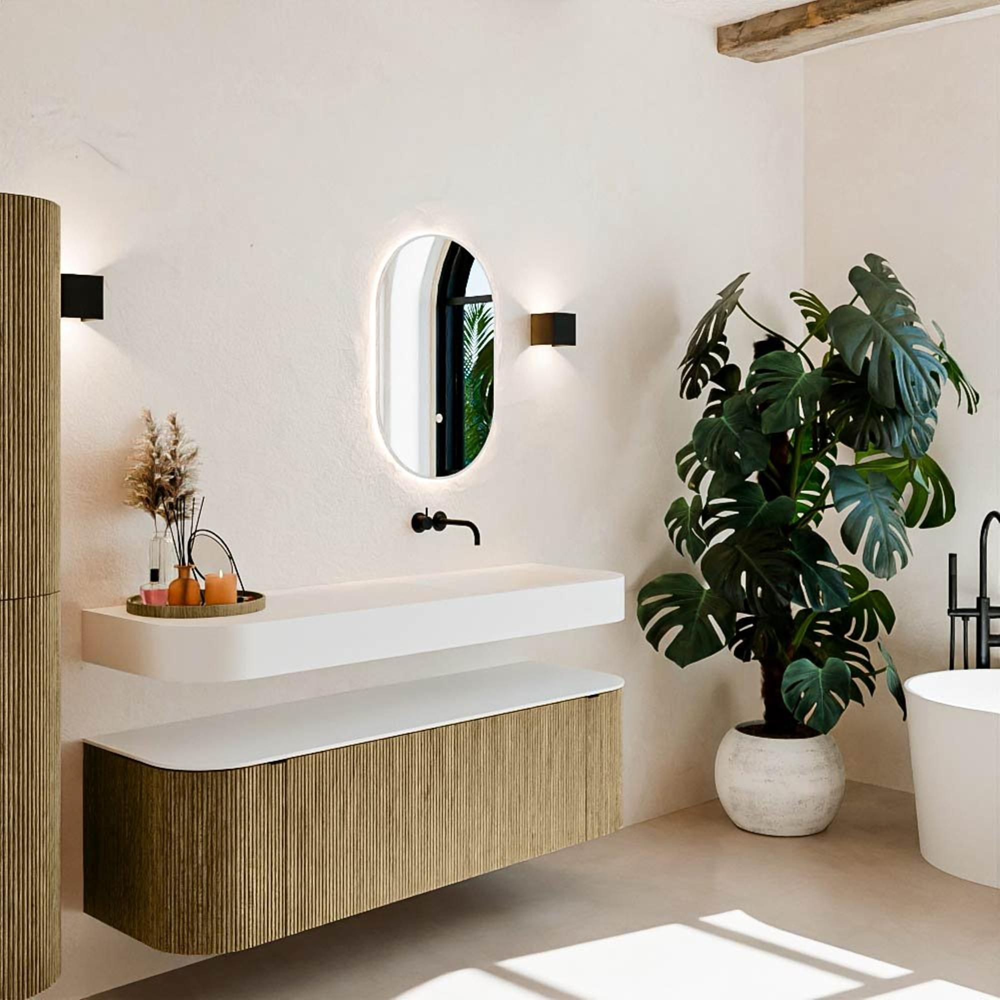 Natuurlijke materialen in warme tinten. De verticale ribbels brengen ritme en textuur in het ontwerp, terwijl het eikenhout zorgt voor een warme, ambachtelijke uitstraling. Kies uit 5 houttinten OAK, WALNUT, DUSK, SHADOW en RUBY zorgvuldig geselecteerde houtkleuren om zowel moderne als klassieke badkamers te verrijken.