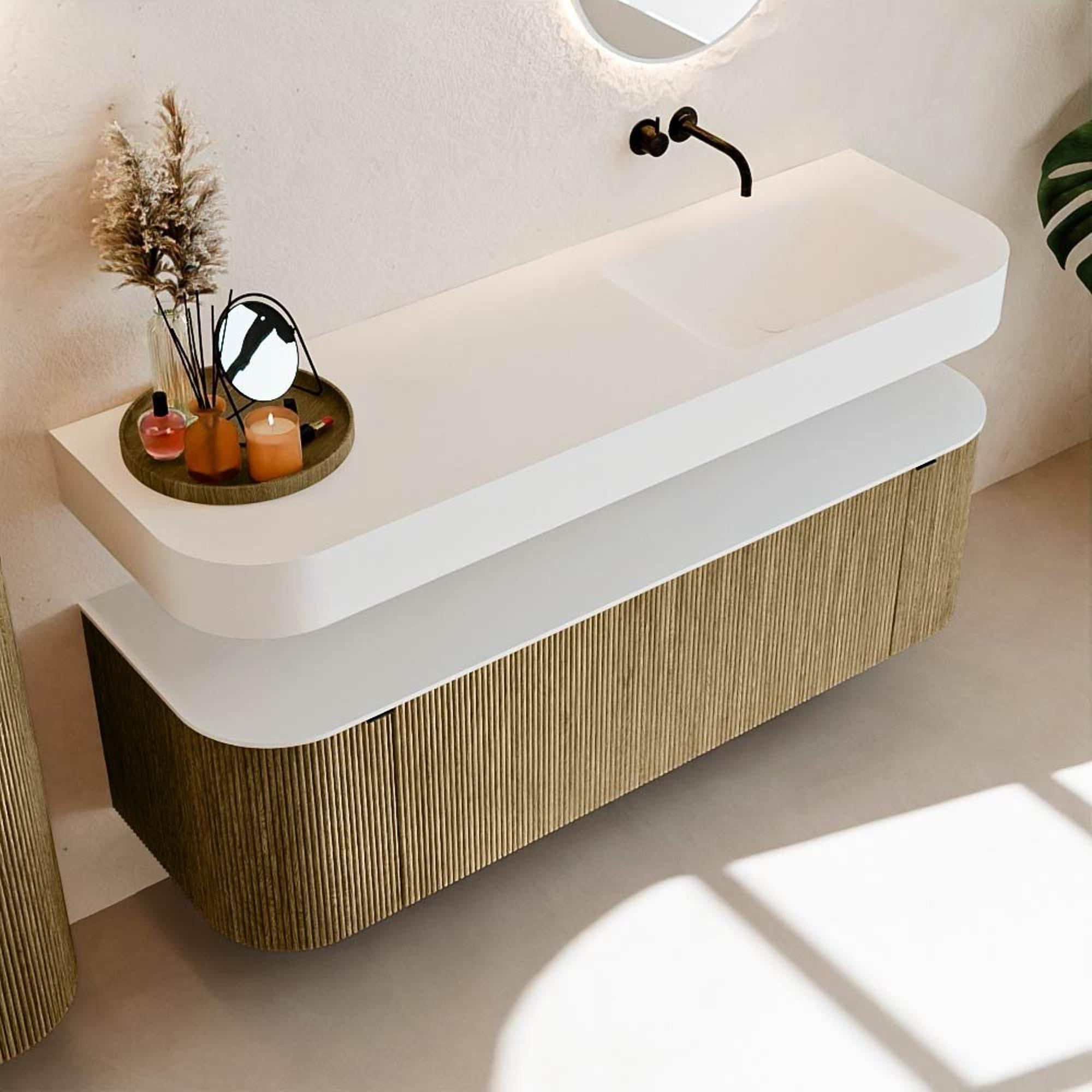 Boven het meubel zweeft een bijpassende, vrij hangende wastafel met afgeronde hoeken – perfect afgestemd op de vorm van de kast. De wastafel is uitgevoerd in Solid Surface en volgt subtiel de lijnen van het onderliggende meubel, waardoor een harmonieus geheel ontstaat. Het Solid Surface topblad vormt een sterke, onderhoudsvriendelijke basis en maakt de combinatie compleet.