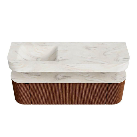 MONDIAZ THOR-DLUX 150cm badmeubel ronding links + rechts kleur Ruby met 1 lade en 2 deuren. Vrijhangende wastafel CLOUD Links 1 kraangat kleur Ostra.