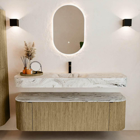 Boven het meubel zweeft een bijpassende, vrij hangende wastafel met afgeronde hoeken – perfect afgestemd op de vorm van de kast. De wastafel is uitgevoerd in Solid Surface en volgt subtiel de lijnen van het onderliggende meubel, waardoor een harmonieus geheel ontstaat. Het Solid Surface topblad vormt een sterke, onderhoudsvriendelijke basis en maakt de combinatie compleet.