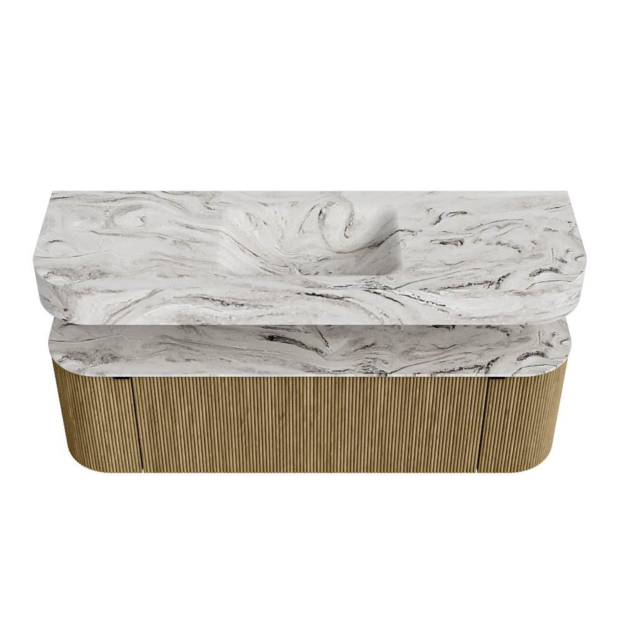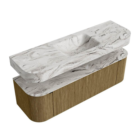 MONDIAZ THOR-DLUX 150cm badmeubel ronding links + rechts kleur Dusk met 1 lade en 2 deuren. Vrijhangende wastafel CLOUD Midden zonder kraangat kleur Glace.