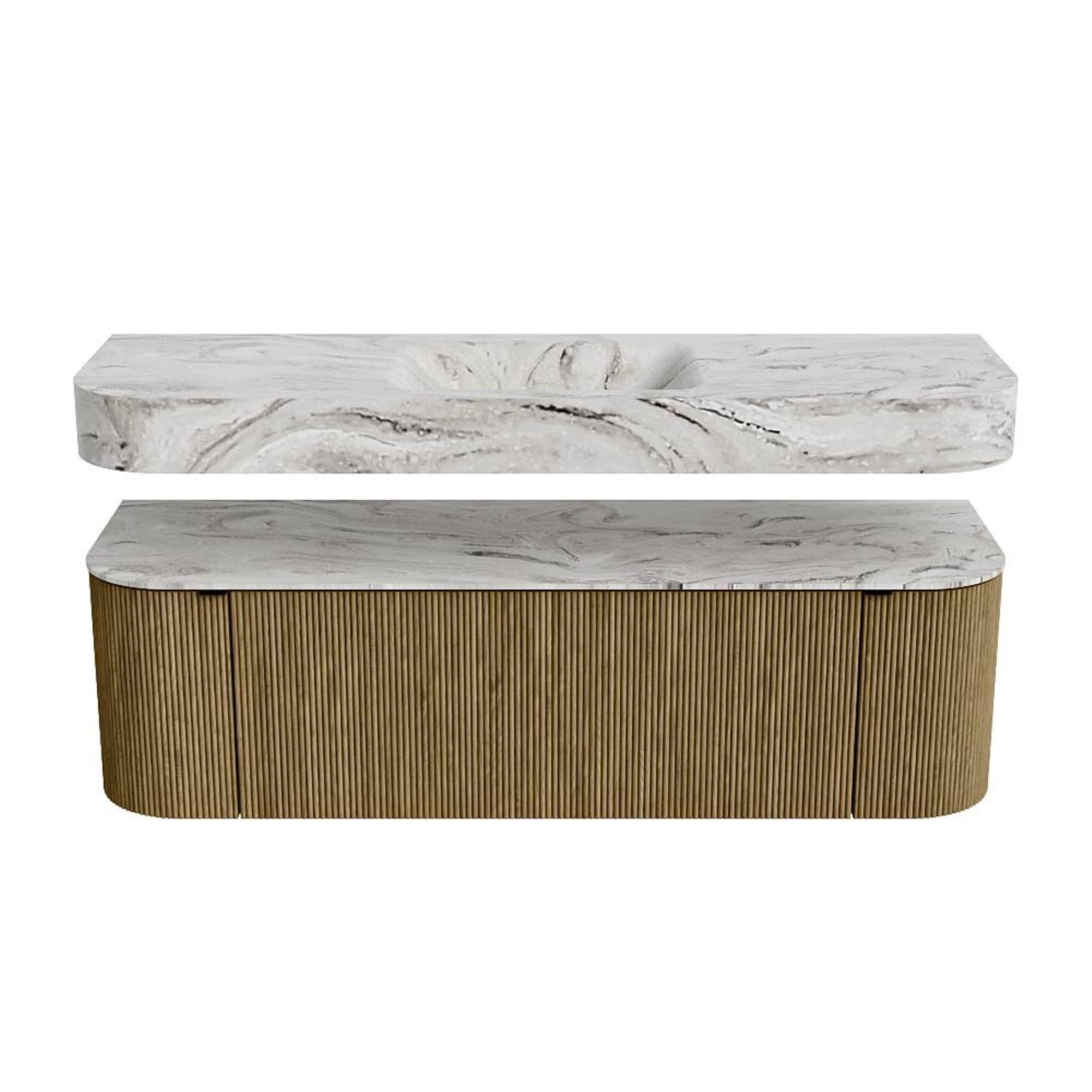 Boven het meubel zweeft een bijpassende, vrij hangende wastafel met afgeronde hoeken – perfect afgestemd op de vorm van de kast. De wastafel is uitgevoerd in Solid Surface en volgt subtiel de lijnen van het onderliggende meubel, waardoor een harmonieus geheel ontstaat. Het Solid Surface topblad vormt een sterke, onderhoudsvriendelijke basis en maakt de combinatie compleet.