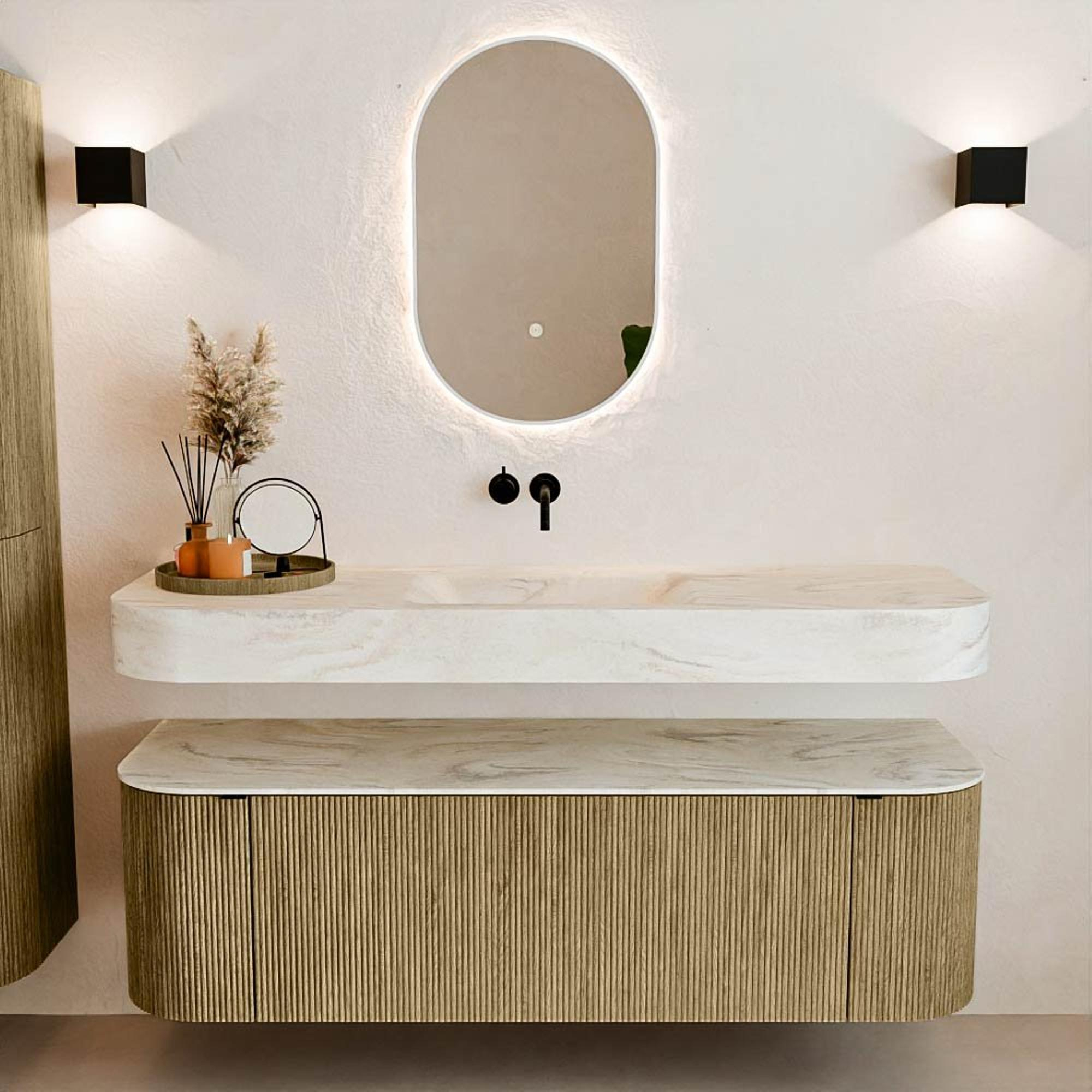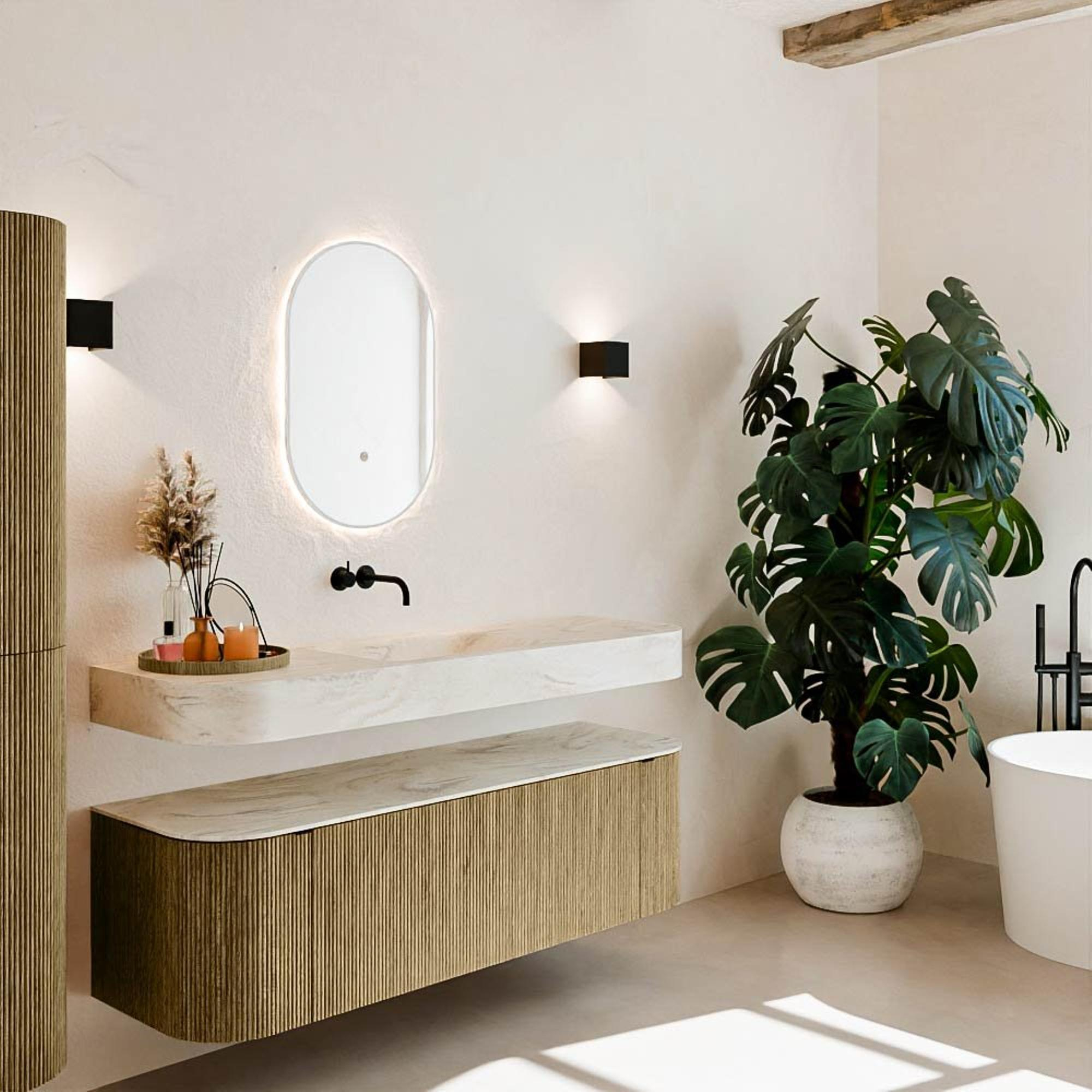 Natuurlijke materialen in warme tinten. De verticale ribbels brengen ritme en textuur in het ontwerp, terwijl het eikenhout zorgt voor een warme, ambachtelijke uitstraling. Kies uit 5 houttinten OAK, WALNUT, DUSK, SHADOW en RUBY zorgvuldig geselecteerde houtkleuren om zowel moderne als klassieke badkamers te verrijken.