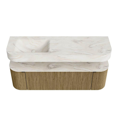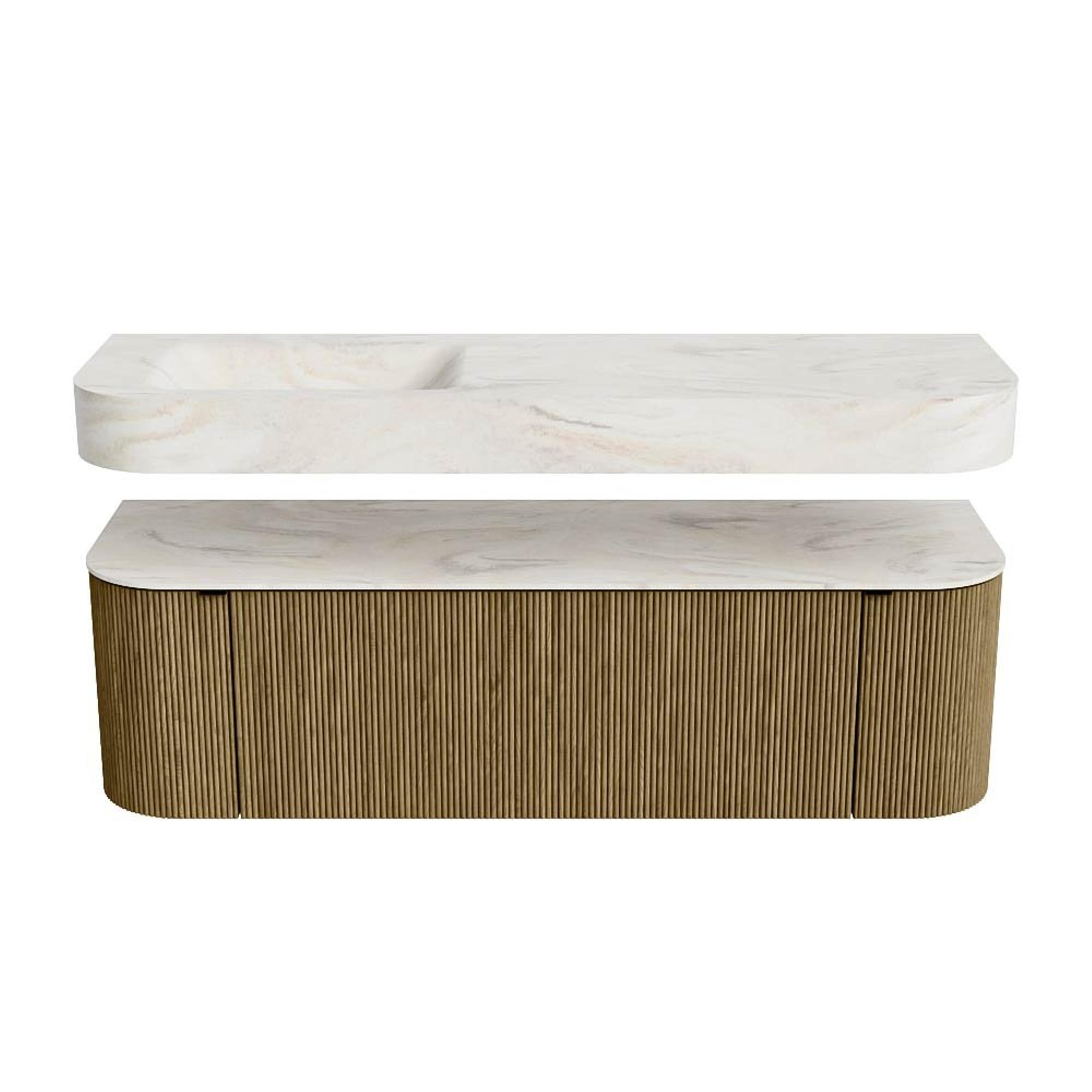 Boven het meubel zweeft een bijpassende, vrij hangende wastafel met afgeronde hoeken – perfect afgestemd op de vorm van de kast. De wastafel is uitgevoerd in Solid Surface en volgt subtiel de lijnen van het onderliggende meubel, waardoor een harmonieus geheel ontstaat. Het Solid Surface topblad vormt een sterke, onderhoudsvriendelijke basis en maakt de combinatie compleet.
