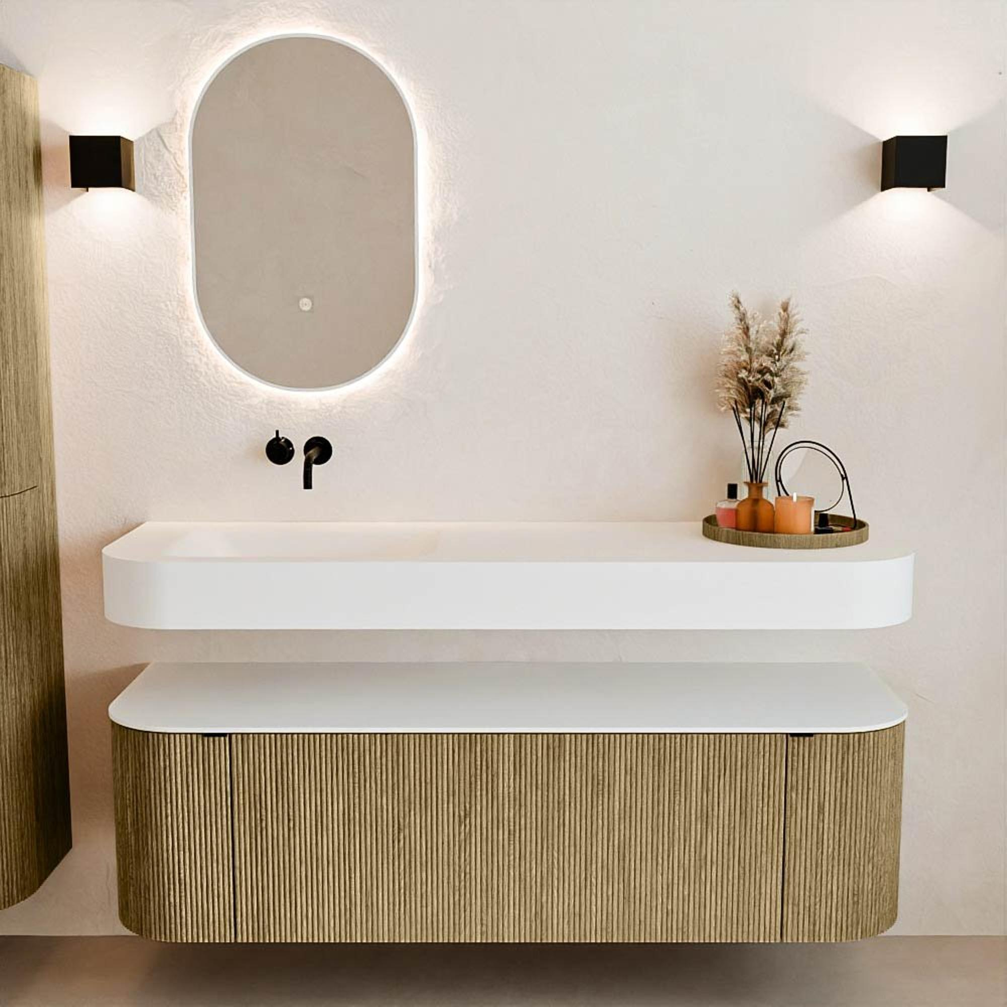 Natuurlijke materialen in warme tinten. De verticale ribbels brengen ritme en textuur in het ontwerp, terwijl het eikenhout zorgt voor een warme, ambachtelijke uitstraling. Kies uit 5 houttinten OAK, WALNUT, DUSK, SHADOW en RUBY zorgvuldig geselecteerde houtkleuren om zowel moderne als klassieke badkamers te verrijken.