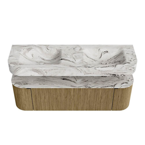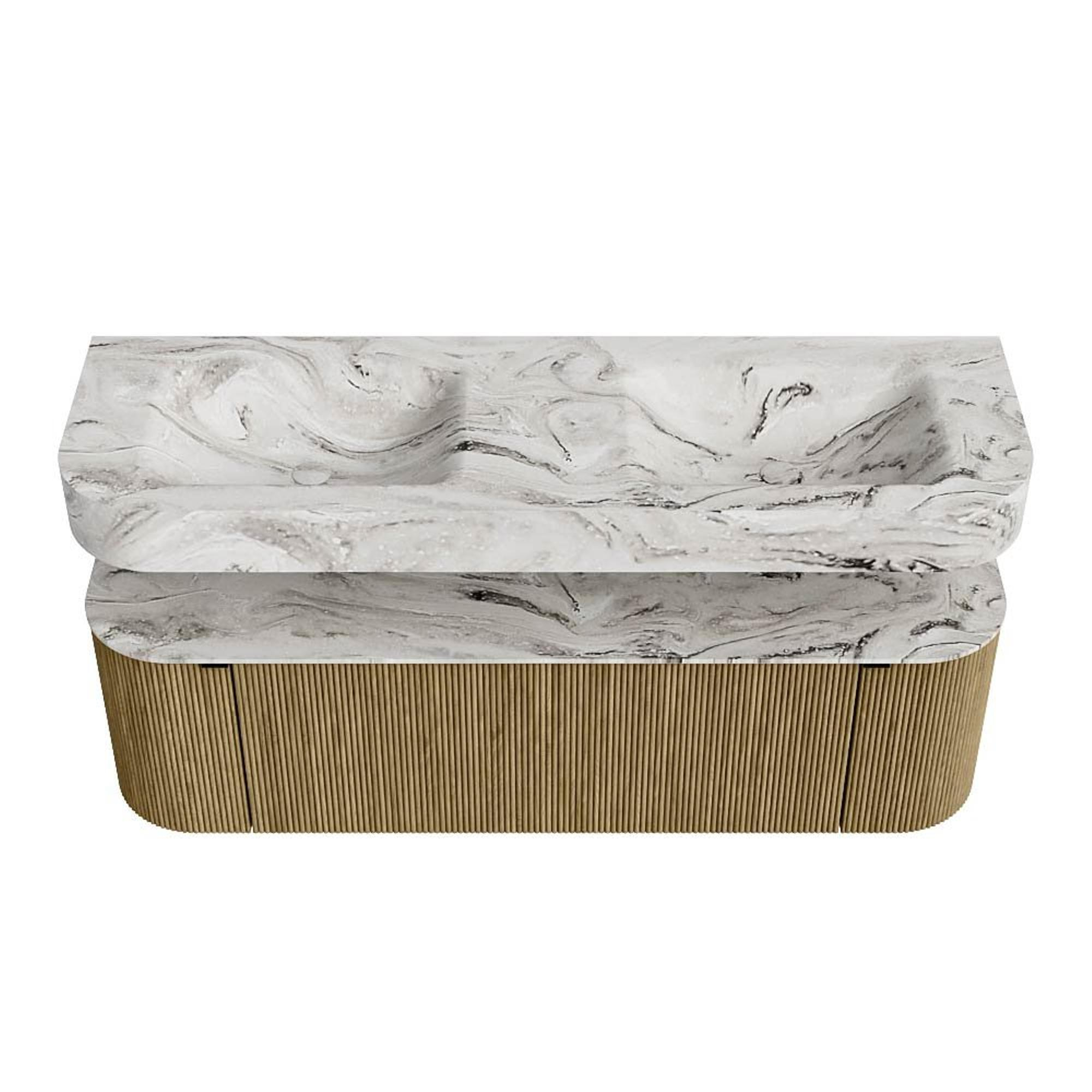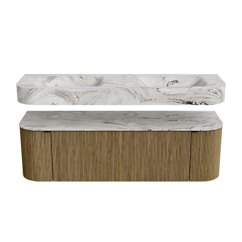 MONDIAZ THOR-DLUX 150cm badmeubel ronding links + rechts kleur Dusk met 1 lade en 2 deuren. Vrijhangende wastafel CLOUD Dubbel zonder kraangat kleur Glace.
