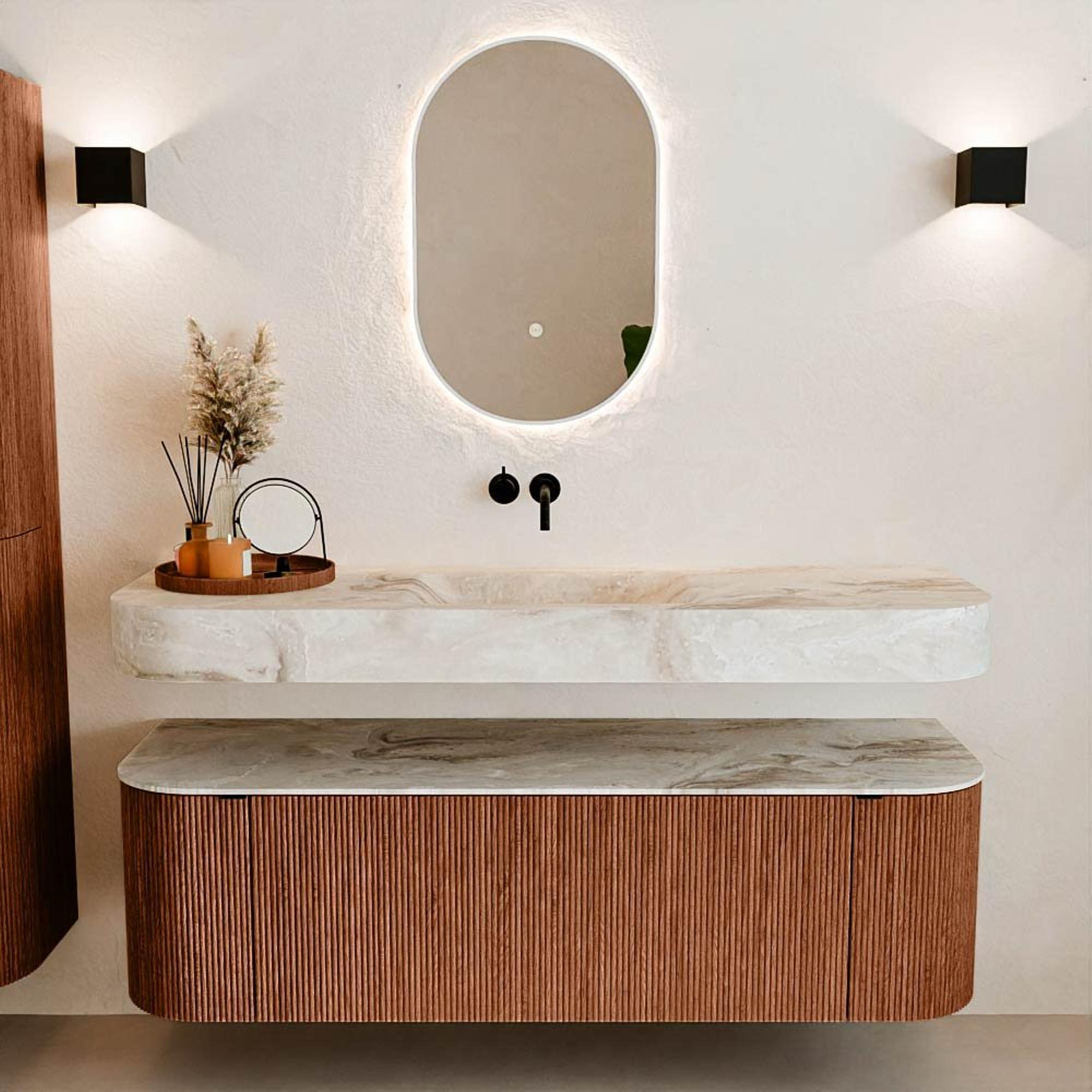 Natuurlijke materialen in warme tinten. De verticale ribbels brengen ritme en textuur in het ontwerp, terwijl het eikenhout zorgt voor een warme, ambachtelijke uitstraling. Kies uit 5 houttinten OAK, WALNUT, DUSK, SHADOW en RUBY zorgvuldig geselecteerde houtkleuren om zowel moderne als klassieke badkamers te verrijken.