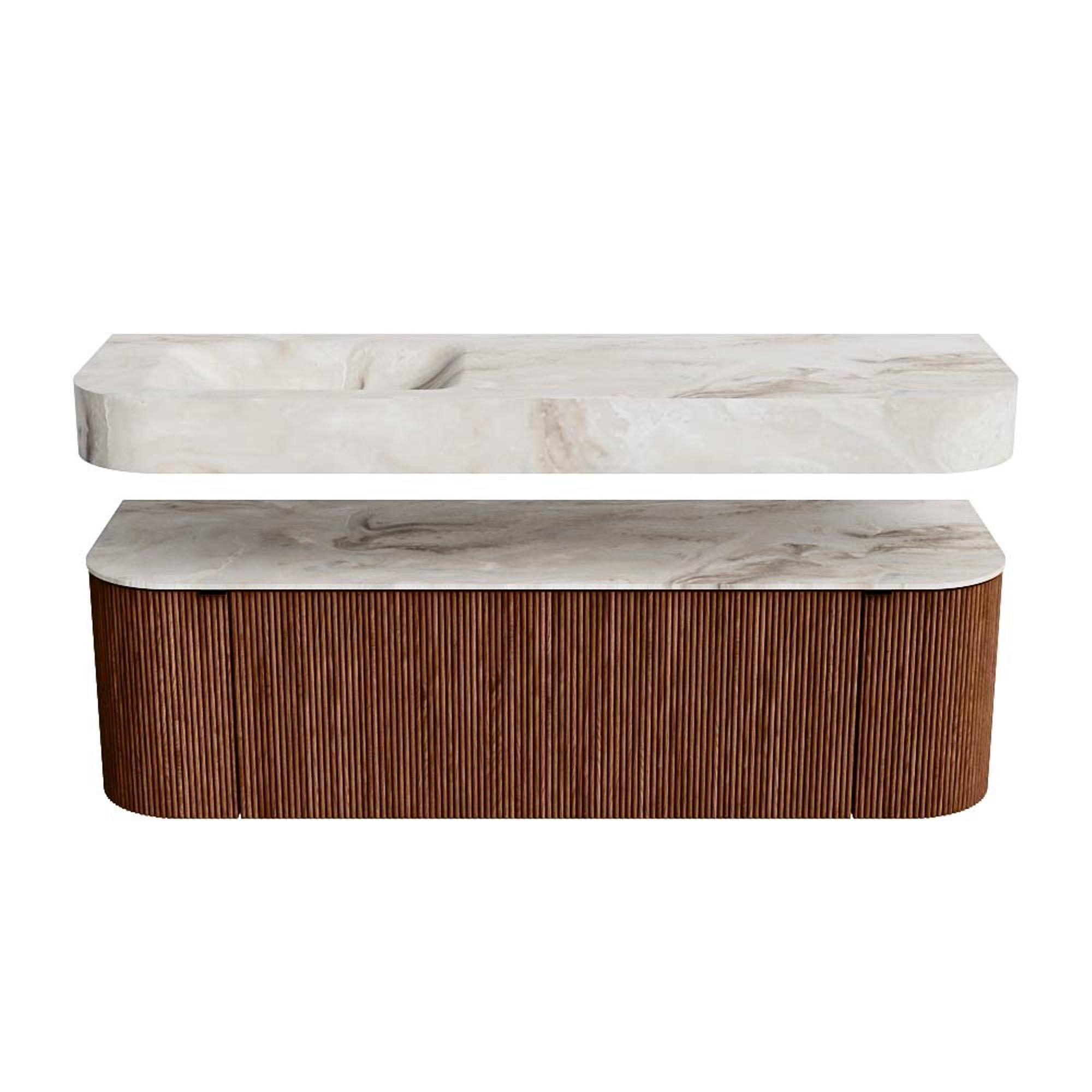 MONDIAZ THOR-DLUX 150cm badmeubel ronding links + rechts kleur Ruby met 1 lade en 2 deuren. Vrijhangende wastafel CLOUD Links 1 kraangat kleur Frappe.