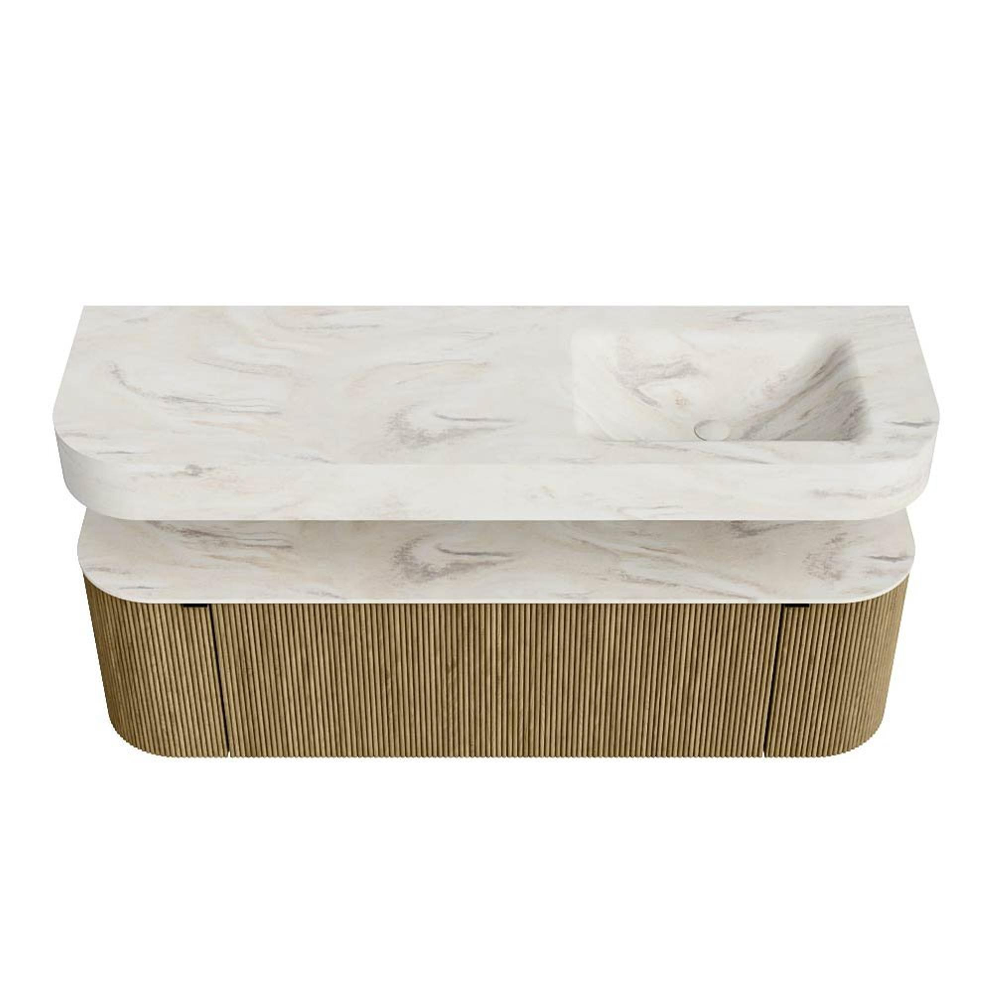 Boven het meubel zweeft een bijpassende, vrij hangende wastafel met afgeronde hoeken – perfect afgestemd op de vorm van de kast. De wastafel is uitgevoerd in Solid Surface en volgt subtiel de lijnen van het onderliggende meubel, waardoor een harmonieus geheel ontstaat. Het Solid Surface topblad vormt een sterke, onderhoudsvriendelijke basis en maakt de combinatie compleet.