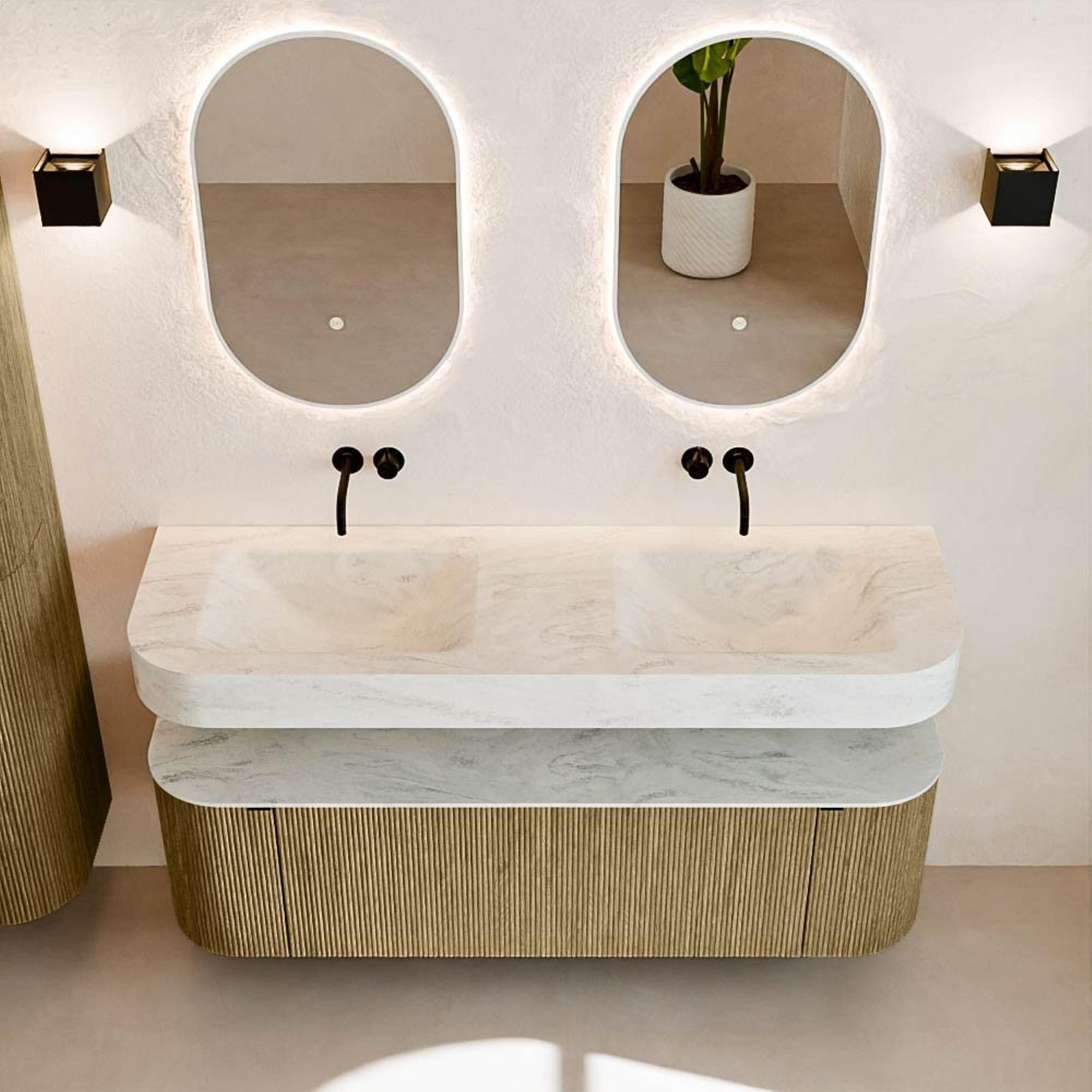 Natuurlijke materialen in warme tinten. De verticale ribbels brengen ritme en textuur in het ontwerp, terwijl het eikenhout zorgt voor een warme, ambachtelijke uitstraling. Kies uit 5 houttinten OAK, WALNUT, DUSK, SHADOW en RUBY zorgvuldig geselecteerde houtkleuren om zowel moderne als klassieke badkamers te verrijken.