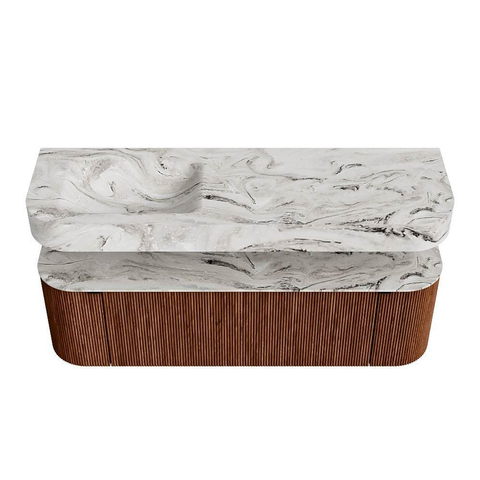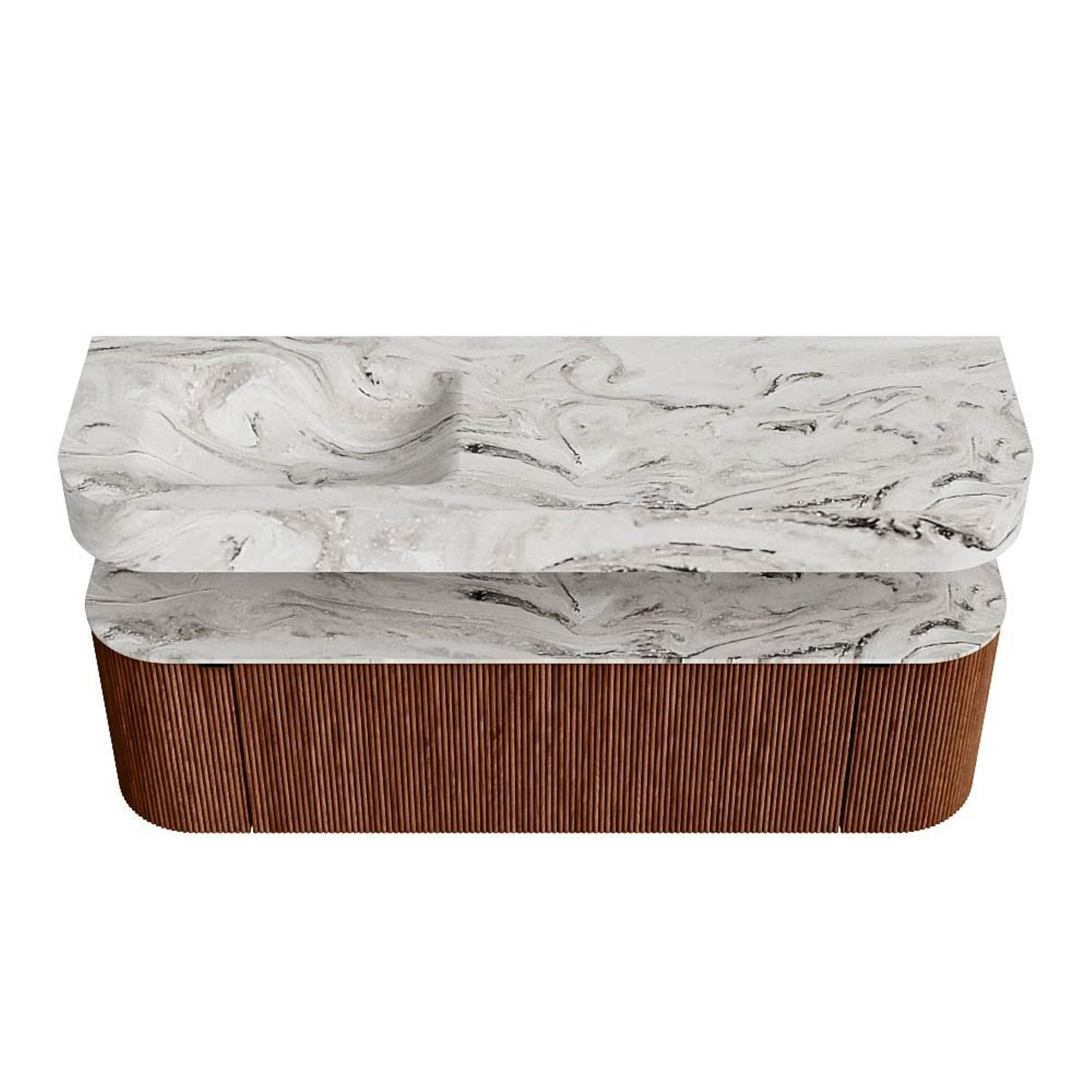 MONDIAZ THOR-DLUX 150cm badmeubel ronding links + rechts kleur Ruby met 1 lade en 2 deuren. Vrijhangende wastafel CLOUD Links 1 kraangat kleur Glace.