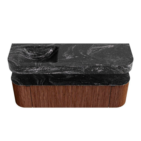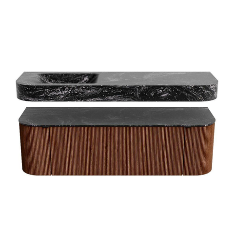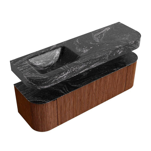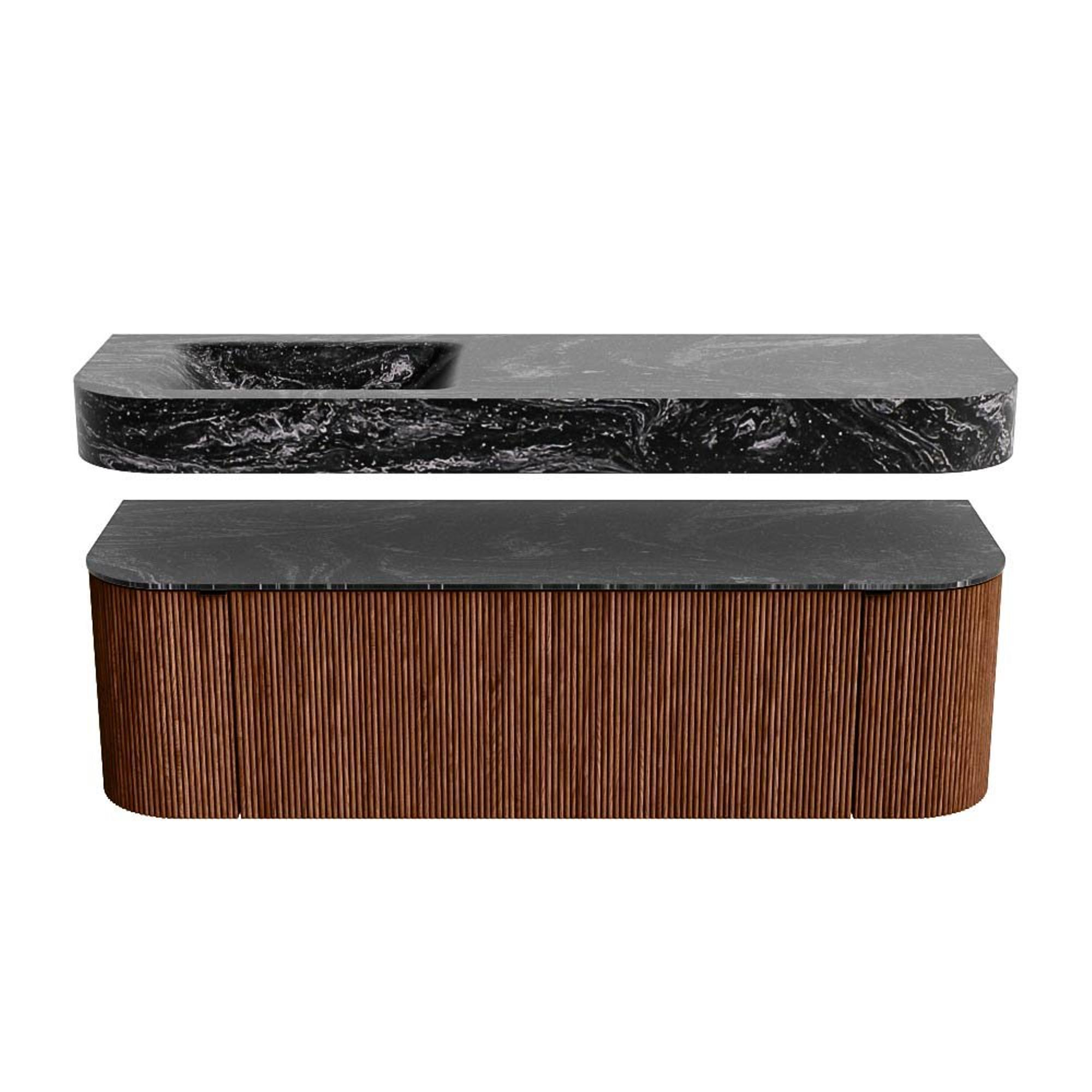 MONDIAZ THOR-DLUX 150cm badmeubel ronding links + rechts kleur Ruby met 1 lade en 2 deuren. Vrijhangende wastafel CLOUD Links 1 kraangat kleur Lava.