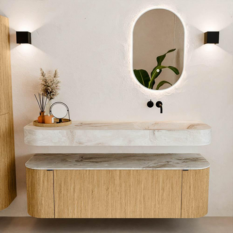Boven het meubel zweeft een bijpassende, vrij hangende wastafel met afgeronde hoeken – perfect afgestemd op de vorm van de kast. De wastafel is uitgevoerd in Solid Surface en volgt subtiel de lijnen van het onderliggende meubel, waardoor een harmonieus geheel ontstaat. Het Solid Surface topblad vormt een sterke, onderhoudsvriendelijke basis en maakt de combinatie compleet.