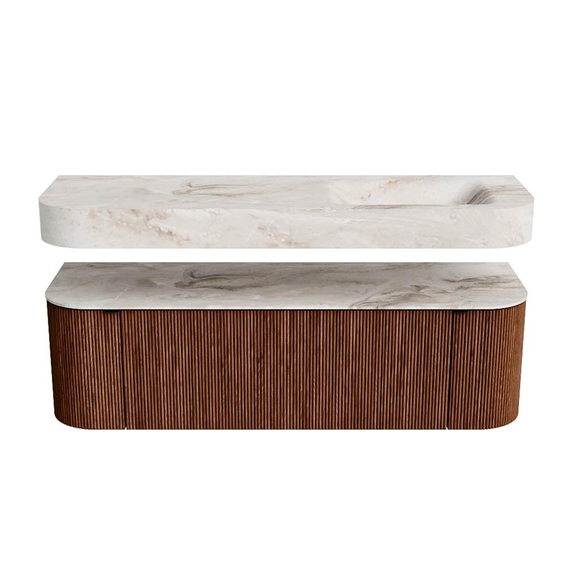 MONDIAZ THOR-DLUX 150cm badmeubel ronding links + rechts kleur Ruby met 1 lade en 2 deuren. Vrijhangende wastafel CLOUD Rechts zonder kraangat kleur Frappe.