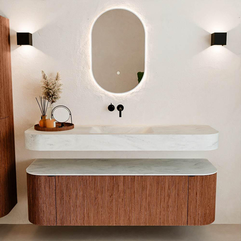 Natuurlijke materialen in warme tinten. De verticale ribbels brengen ritme en textuur in het ontwerp, terwijl het eikenhout zorgt voor een warme, ambachtelijke uitstraling. Kies uit 5 houttinten OAK, WALNUT, DUSK, SHADOW en RUBY zorgvuldig geselecteerde houtkleuren om zowel moderne als klassieke badkamers te verrijken.