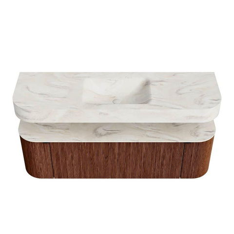 MONDIAZ THOR-DLUX 150cm badmeubel ronding links + rechts kleur Ruby met 1 lade en 2 deuren. Vrijhangende wastafel CLOUD Midden 1 kraangat kleur Ostra.