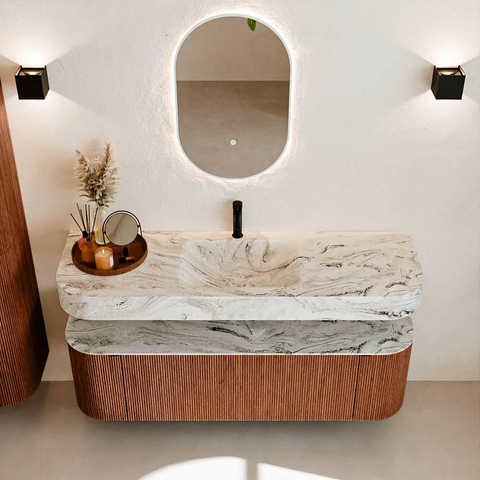 Natuurlijke materialen in warme tinten. De verticale ribbels brengen ritme en textuur in het ontwerp, terwijl het eikenhout zorgt voor een warme, ambachtelijke uitstraling. Kies uit 5 houttinten OAK, WALNUT, DUSK, SHADOW en RUBY zorgvuldig geselecteerde houtkleuren om zowel moderne als klassieke badkamers te verrijken.