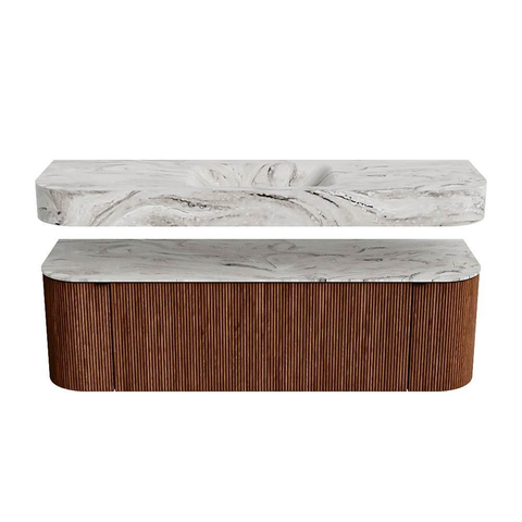 Boven het meubel zweeft een bijpassende, vrij hangende wastafel met afgeronde hoeken – perfect afgestemd op de vorm van de kast. De wastafel is uitgevoerd in Solid Surface en volgt subtiel de lijnen van het onderliggende meubel, waardoor een harmonieus geheel ontstaat. Het Solid Surface topblad vormt een sterke, onderhoudsvriendelijke basis en maakt de combinatie compleet.
