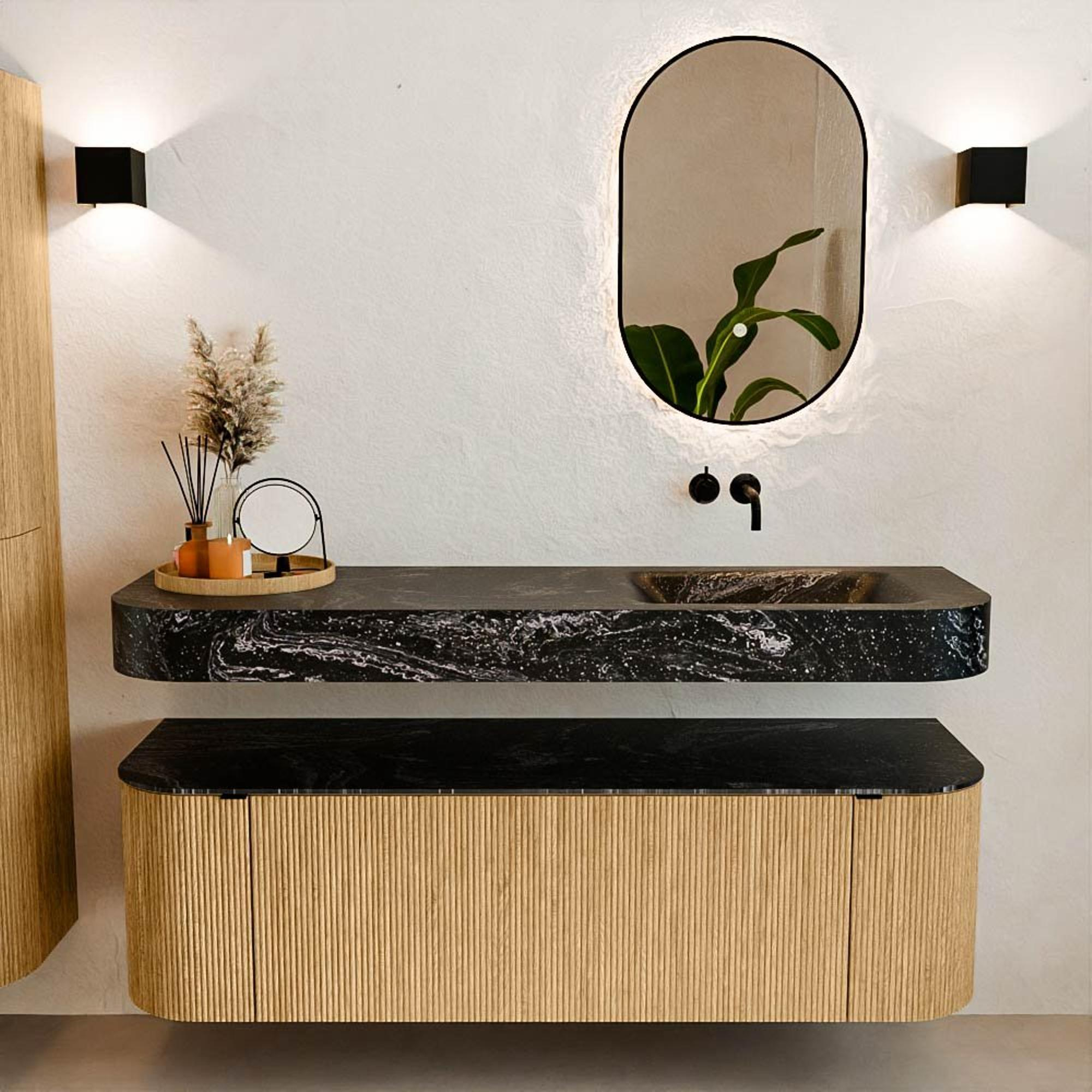 MONDIAZ THOR-DLUX 150cm badmeubel ronding links + rechts kleur Oak met 1 lade en 2 deuren. Vrijhangende wastafel CLOUD Rechts zonder kraangat kleur Lava.
