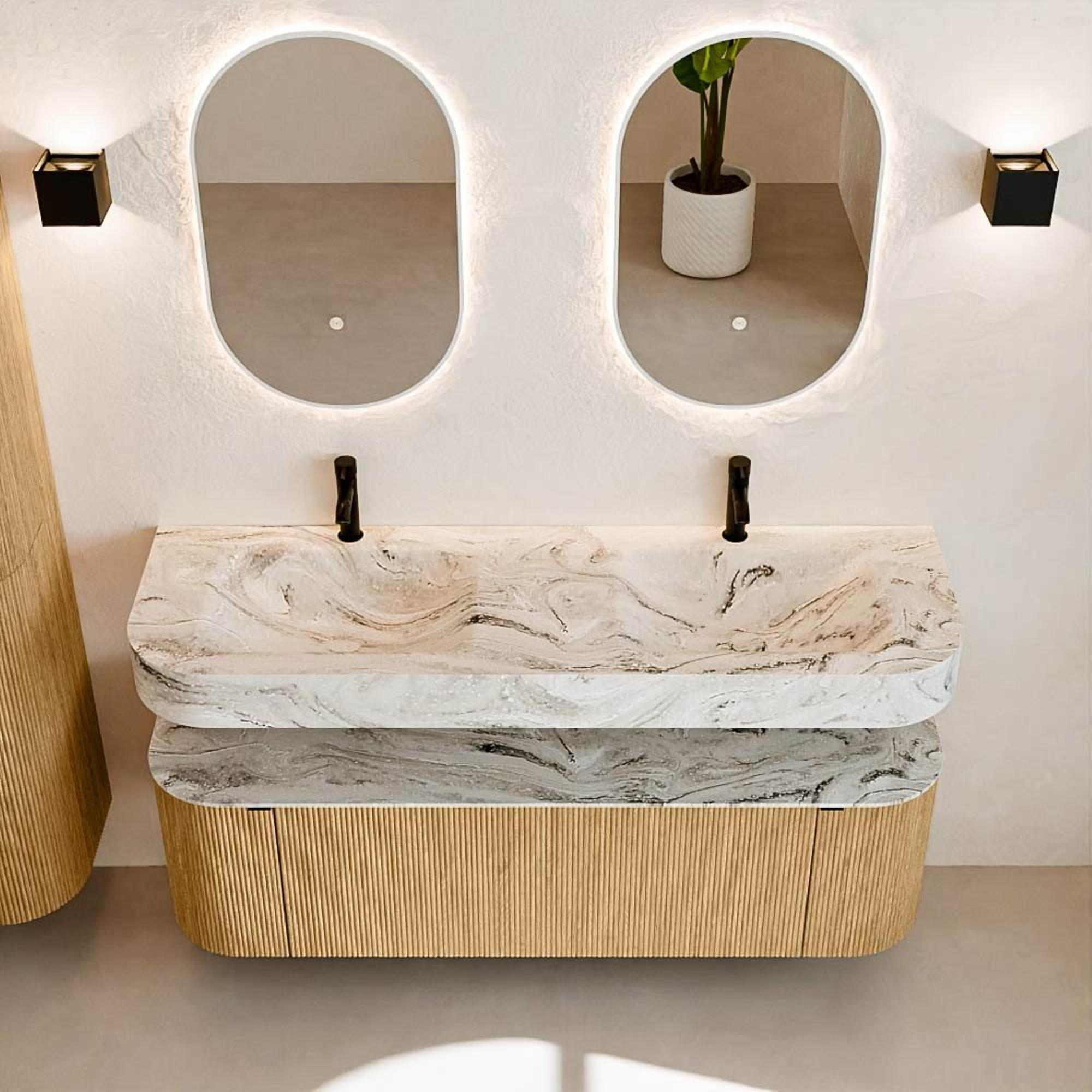 MONDIAZ THOR-DLUX 150cm badmeubel ronding links + rechts kleur Oak met 1 lade en 2 deuren. Vrijhangende wastafel CLOUD Dubbel 2 kraangaten kleur Glace.