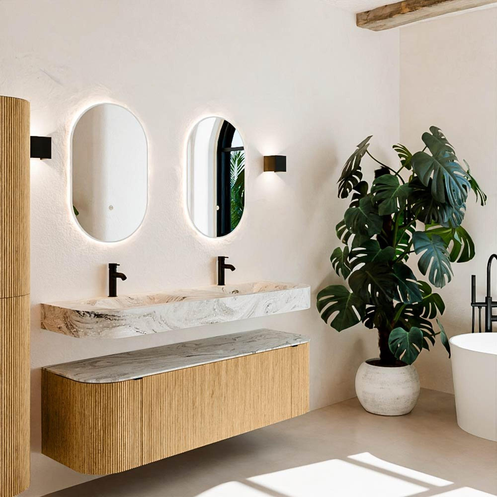 Natuurlijke materialen in warme tinten. De verticale ribbels brengen ritme en textuur in het ontwerp, terwijl het eikenhout zorgt voor een warme, ambachtelijke uitstraling. Kies uit 5 houttinten OAK, WALNUT, DUSK, SHADOW en RUBY zorgvuldig geselecteerde houtkleuren om zowel moderne als klassieke badkamers te verrijken.