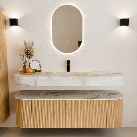 Natuurlijke materialen in warme tinten. De verticale ribbels brengen ritme en textuur in het ontwerp, terwijl het eikenhout zorgt voor een warme, ambachtelijke uitstraling. Kies uit 5 houttinten OAK, WALNUT, DUSK, SHADOW en RUBY zorgvuldig geselecteerde houtkleuren om zowel moderne als klassieke badkamers te verrijken.