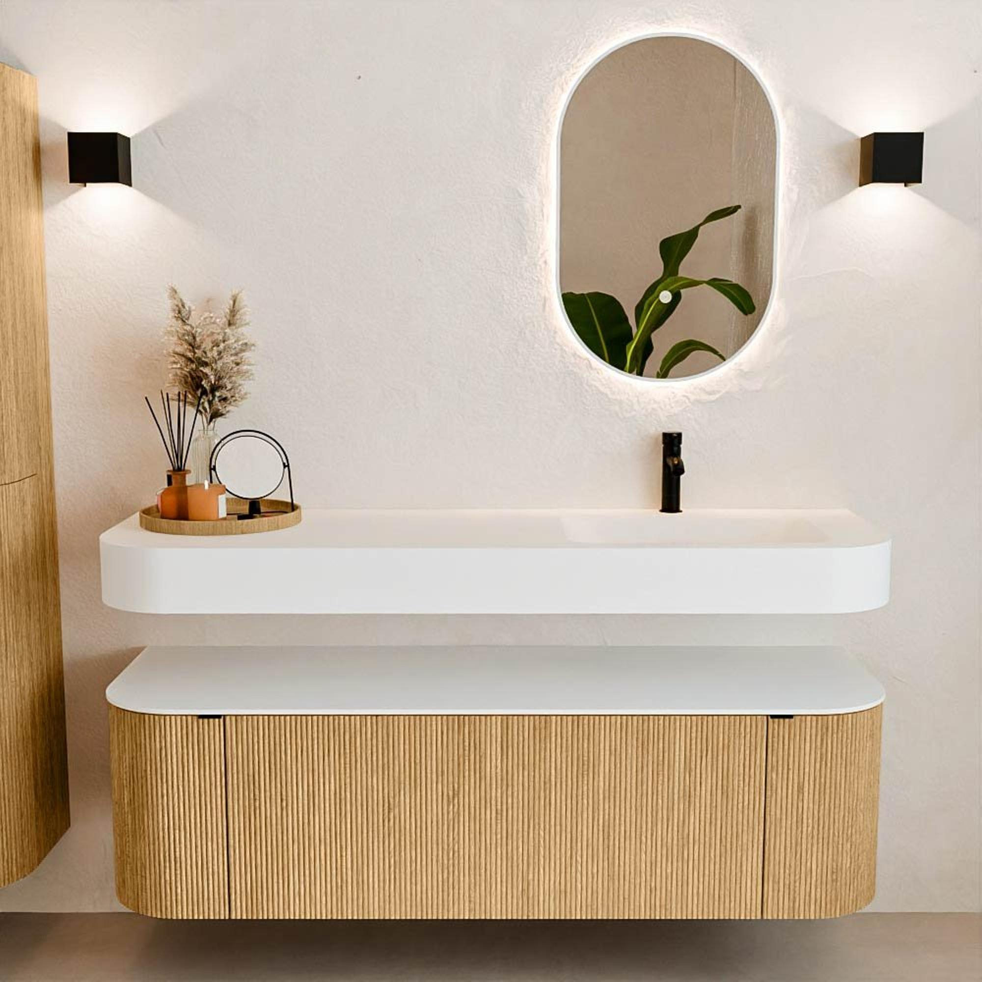 Boven het meubel zweeft een bijpassende, vrij hangende wastafel met afgeronde hoeken – perfect afgestemd op de vorm van de kast. De wastafel is uitgevoerd in Solid Surface en volgt subtiel de lijnen van het onderliggende meubel, waardoor een harmonieus geheel ontstaat. Het Solid Surface topblad vormt een sterke, onderhoudsvriendelijke basis en maakt de combinatie compleet.