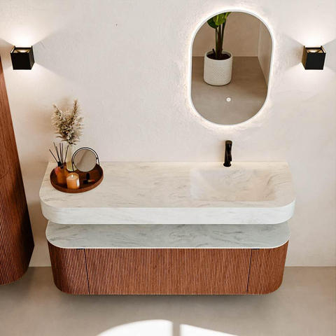MONDIAZ THOR-DLUX 150cm badmeubel ronding links + rechts kleur Ruby met 1 lade en 2 deuren. Vrijhangende wastafel CLOUD Rechts 1 kraangat kleur Opalo.