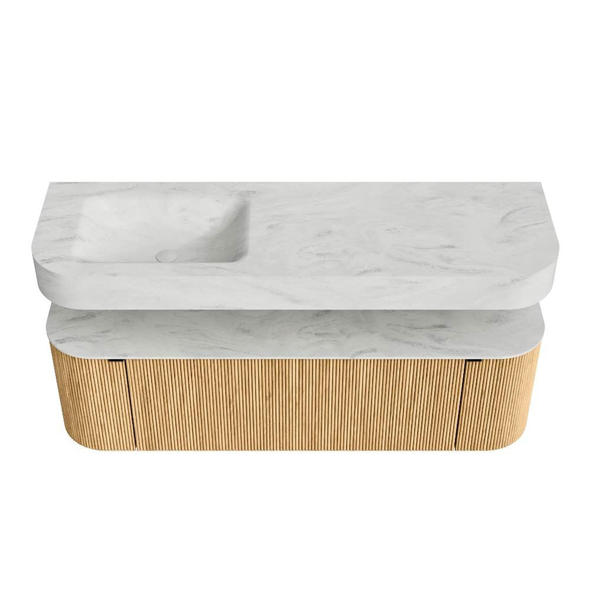 MONDIAZ THOR-DLUX 150cm badmeubel ronding links + rechts kleur Oak met 1 lade en 2 deuren. Vrijhangende wastafel CLOUD Links zonder kraangat kleur Opalo.