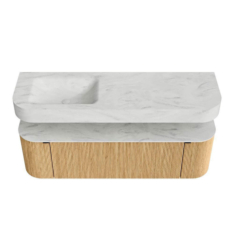Boven het meubel zweeft een bijpassende, vrij hangende wastafel met afgeronde hoeken – perfect afgestemd op de vorm van de kast. De wastafel is uitgevoerd in Solid Surface en volgt subtiel de lijnen van het onderliggende meubel, waardoor een harmonieus geheel ontstaat. Het Solid Surface topblad vormt een sterke, onderhoudsvriendelijke basis en maakt de combinatie compleet.