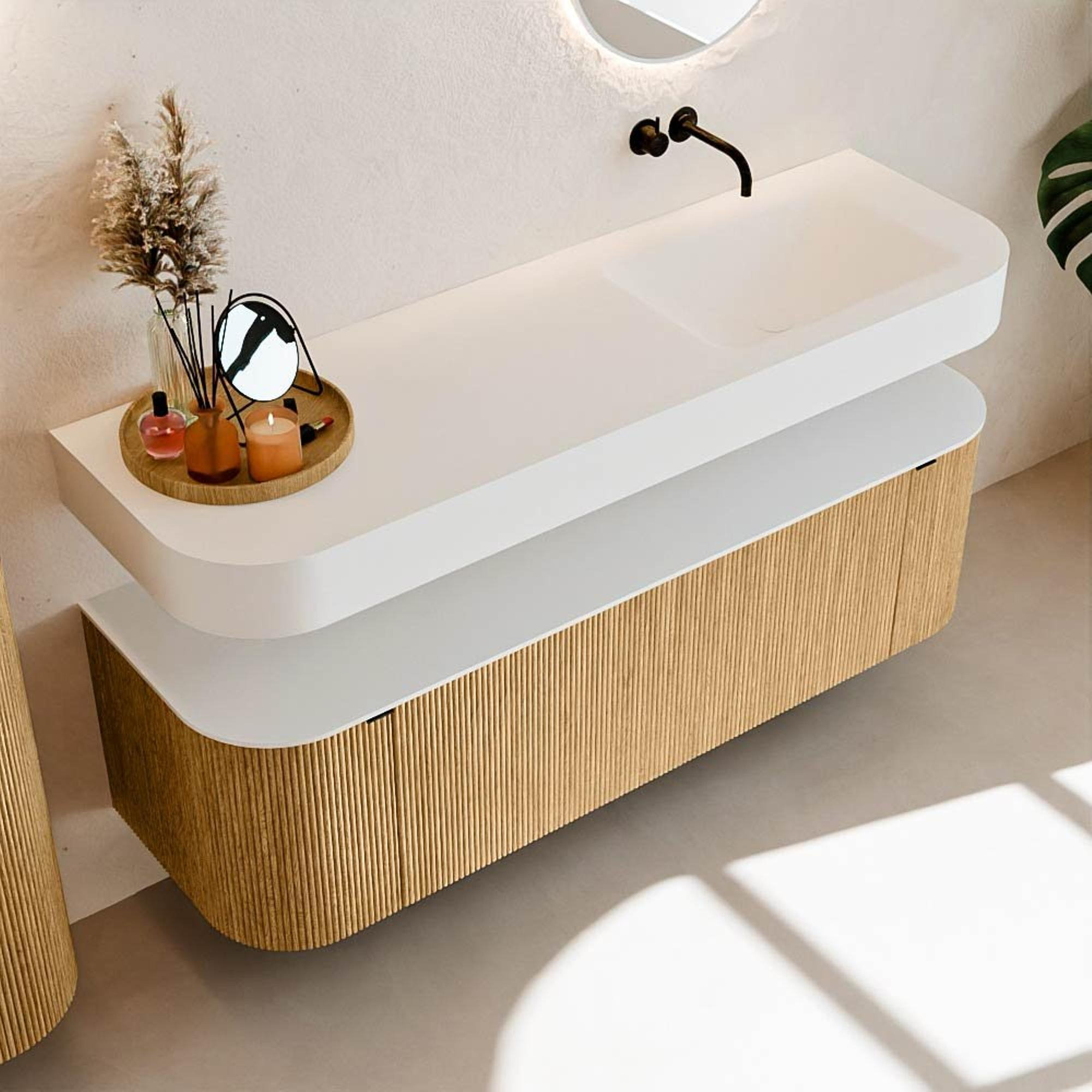 Boven het meubel zweeft een bijpassende, vrij hangende wastafel met afgeronde hoeken – perfect afgestemd op de vorm van de kast. De wastafel is uitgevoerd in Solid Surface en volgt subtiel de lijnen van het onderliggende meubel, waardoor een harmonieus geheel ontstaat. Het Solid Surface topblad vormt een sterke, onderhoudsvriendelijke basis en maakt de combinatie compleet.