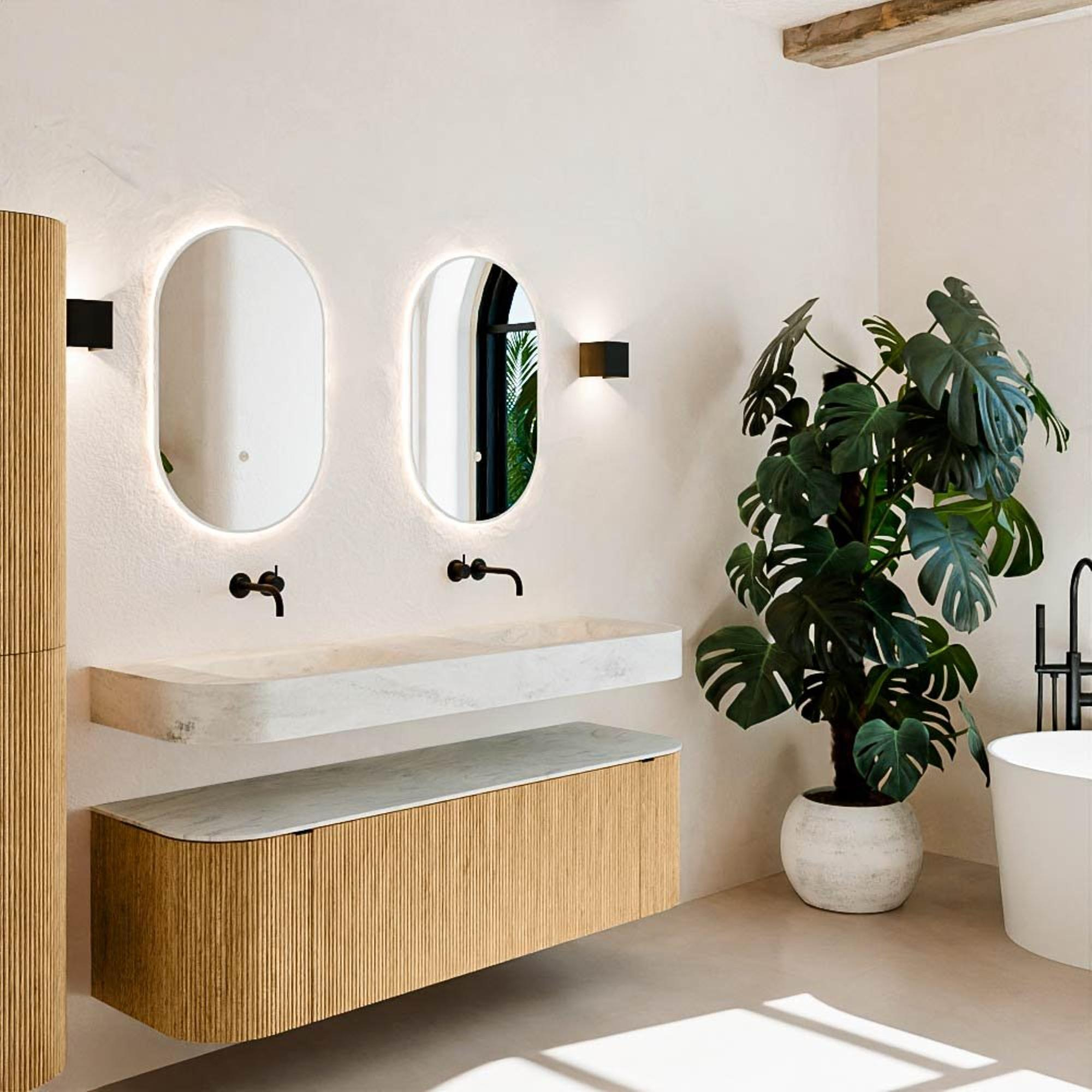 Natuurlijke materialen in warme tinten. De verticale ribbels brengen ritme en textuur in het ontwerp, terwijl het eikenhout zorgt voor een warme, ambachtelijke uitstraling. Kies uit 5 houttinten OAK, WALNUT, DUSK, SHADOW en RUBY zorgvuldig geselecteerde houtkleuren om zowel moderne als klassieke badkamers te verrijken.