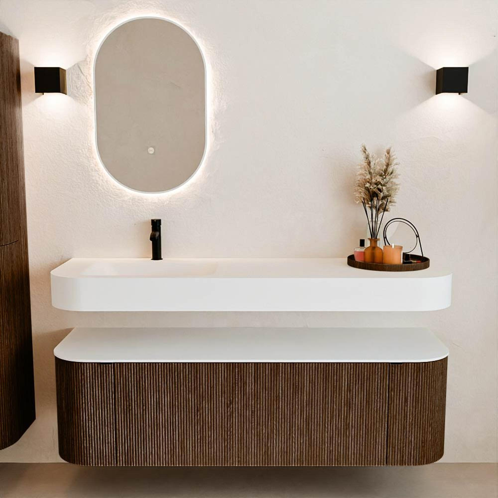 Natuurlijke materialen in warme tinten. De verticale ribbels brengen ritme en textuur in het ontwerp, terwijl het eikenhout zorgt voor een warme, ambachtelijke uitstraling. Kies uit 5 houttinten OAK, WALNUT, DUSK, SHADOW en RUBY zorgvuldig geselecteerde houtkleuren om zowel moderne als klassieke badkamers te verrijken.