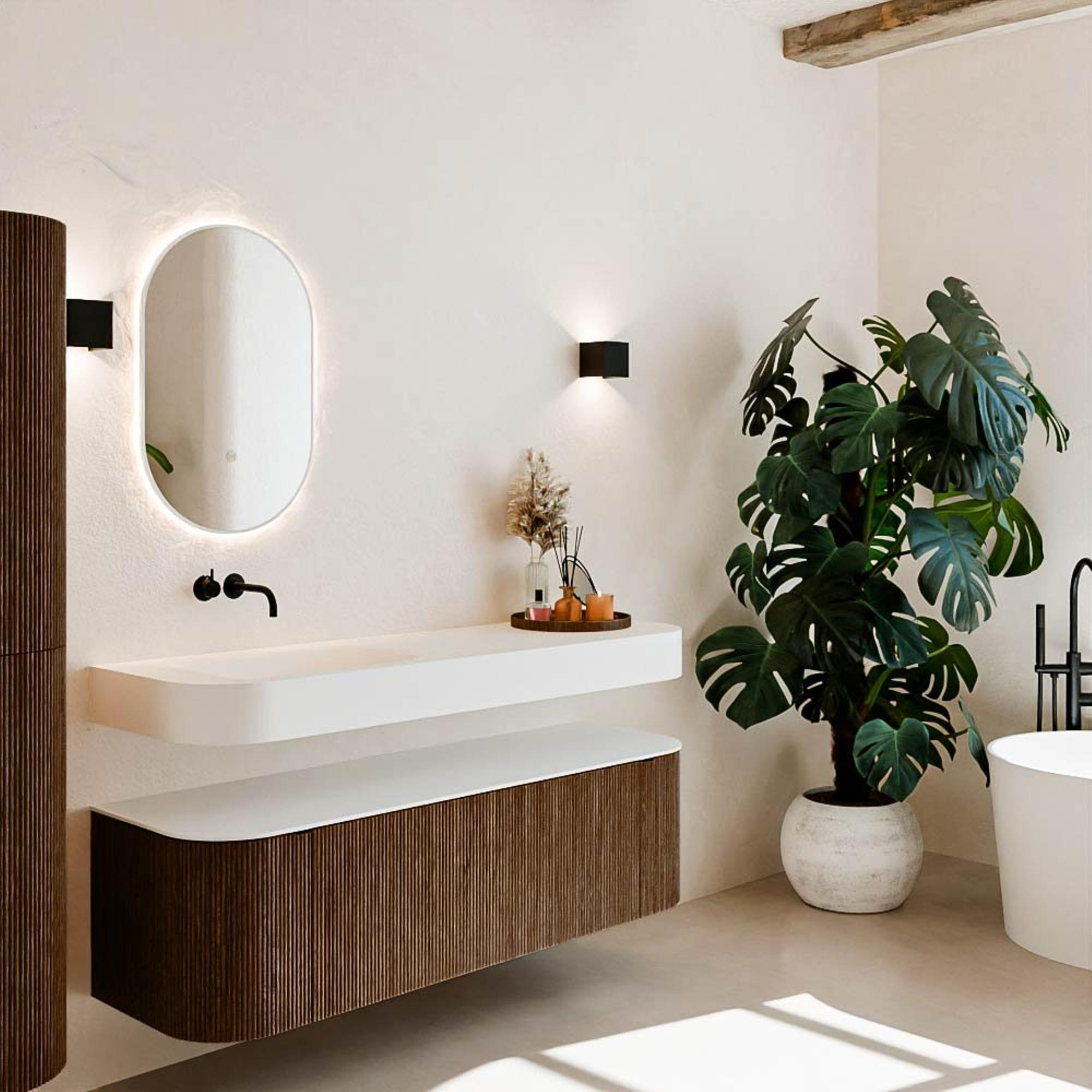 Natuurlijke materialen in warme tinten. De verticale ribbels brengen ritme en textuur in het ontwerp, terwijl het eikenhout zorgt voor een warme, ambachtelijke uitstraling. Kies uit 5 houttinten OAK, WALNUT, DUSK, SHADOW en RUBY zorgvuldig geselecteerde houtkleuren om zowel moderne als klassieke badkamers te verrijken.