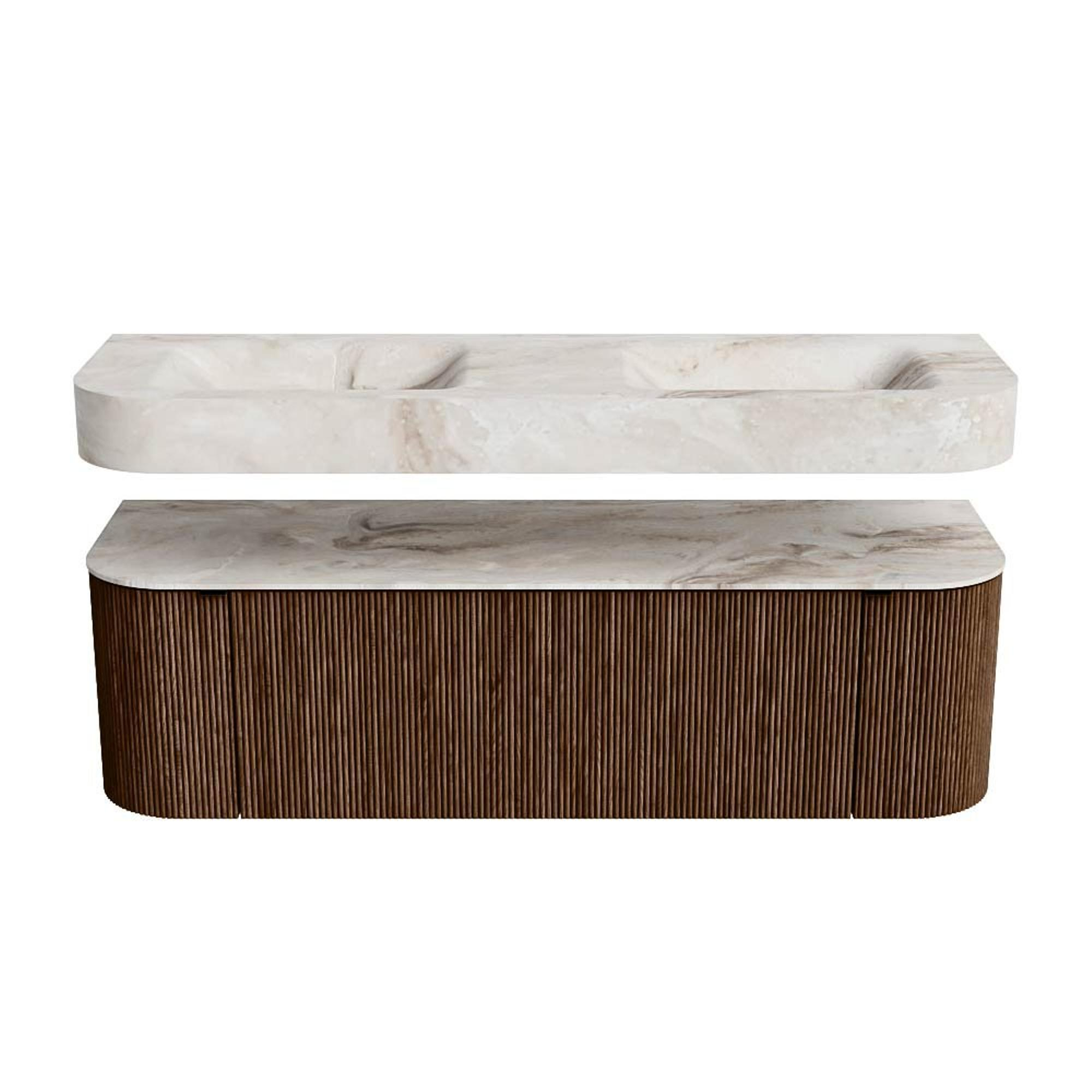 MONDIAZ THOR-DLUX 150cm badmeubel ronding links + rechts kleur Walnut met 1 lade en 2 deuren. Vrijhangende wastafel CLOUD Dubbel 2 kraangaten kleur Frappe.