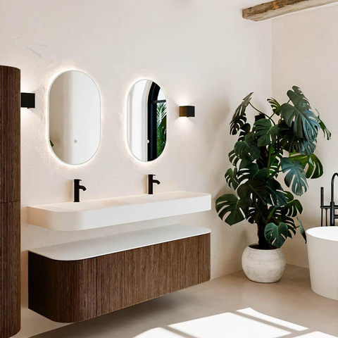 Natuurlijke materialen in warme tinten. De verticale ribbels brengen ritme en textuur in het ontwerp, terwijl het eikenhout zorgt voor een warme, ambachtelijke uitstraling. Kies uit 5 houttinten OAK, WALNUT, DUSK, SHADOW en RUBY zorgvuldig geselecteerde houtkleuren om zowel moderne als klassieke badkamers te verrijken.