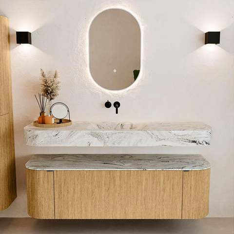 Boven het meubel zweeft een bijpassende, vrij hangende wastafel met afgeronde hoeken – perfect afgestemd op de vorm van de kast. De wastafel is uitgevoerd in Solid Surface en volgt subtiel de lijnen van het onderliggende meubel, waardoor een harmonieus geheel ontstaat. Het Solid Surface topblad vormt een sterke, onderhoudsvriendelijke basis en maakt de combinatie compleet.