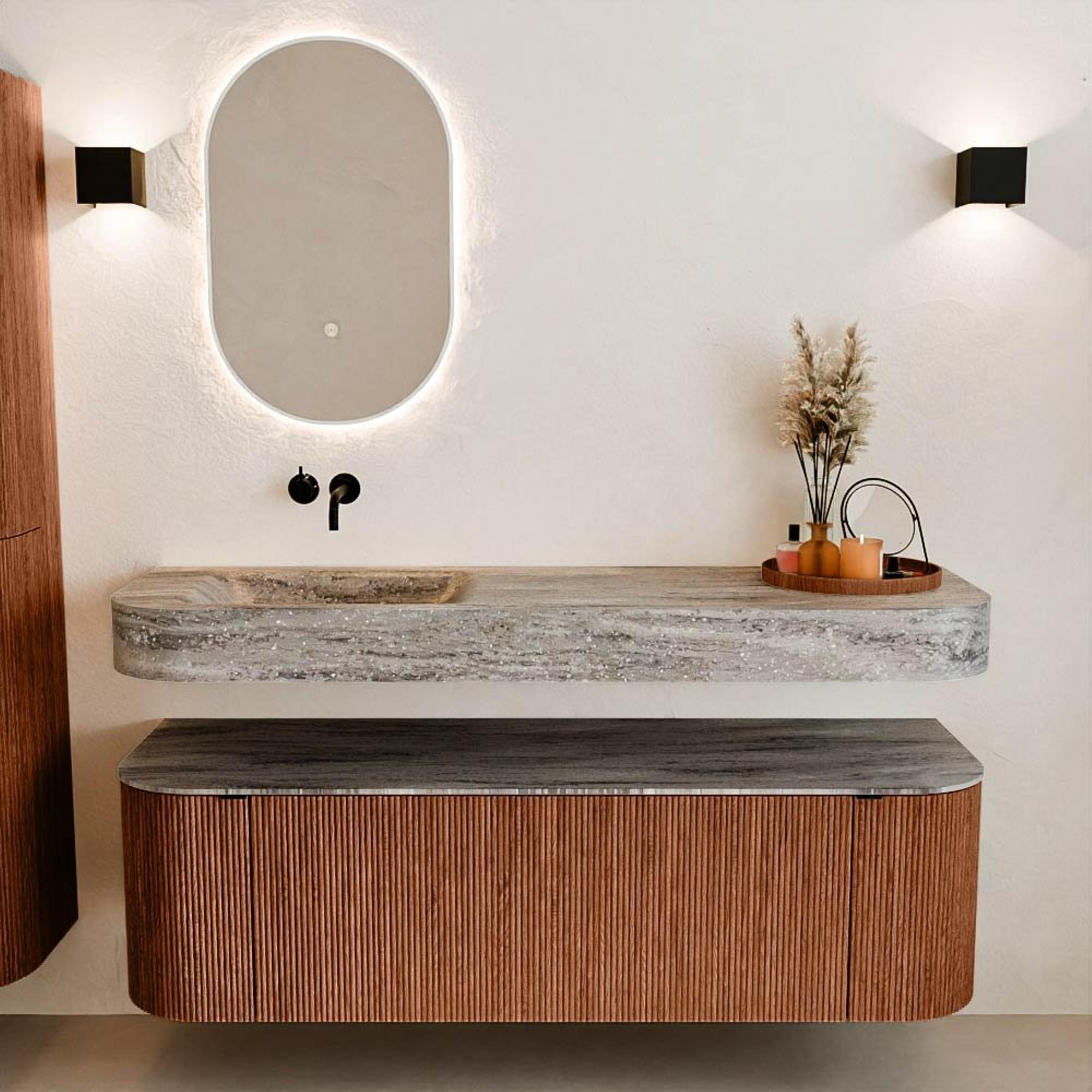 Natuurlijke materialen in warme tinten. De verticale ribbels brengen ritme en textuur in het ontwerp, terwijl het eikenhout zorgt voor een warme, ambachtelijke uitstraling. Kies uit 5 houttinten OAK, WALNUT, DUSK, SHADOW en RUBY zorgvuldig geselecteerde houtkleuren om zowel moderne als klassieke badkamers te verrijken.