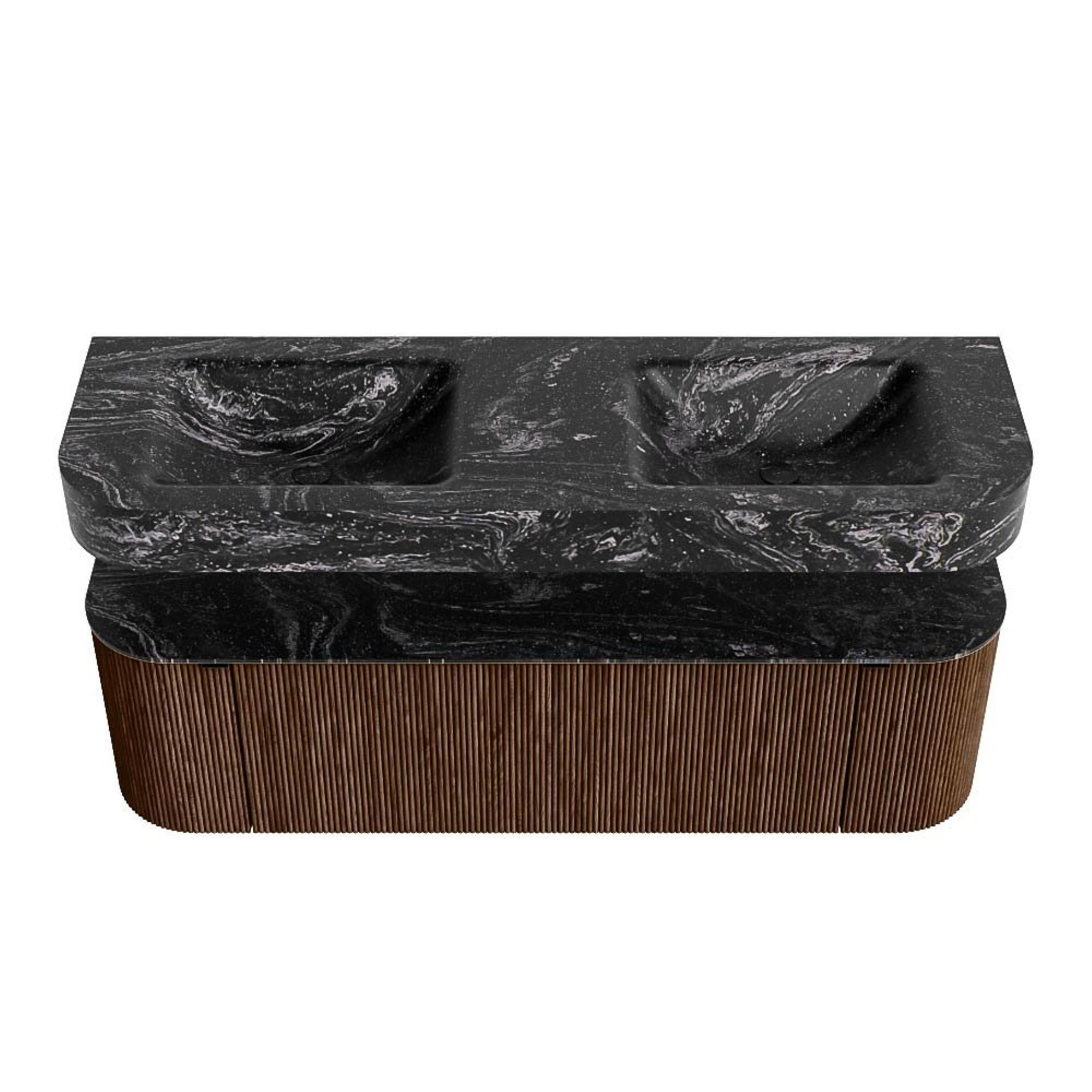 MONDIAZ THOR-DLUX 150cm badmeubel ronding links + rechts kleur Walnut met 1 lade en 2 deuren. Vrijhangende wastafel CLOUD Dubbel 2 kraangaten kleur Lava.