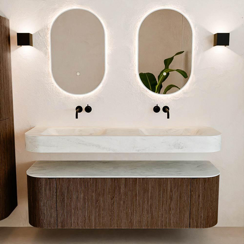 MONDIAZ THOR-DLUX 150cm badmeubel ronding links + rechts kleur Walnut met 1 lade en 2 deuren. Vrijhangende wastafel CLOUD Dubbel zonder kraangat kleur Opalo.