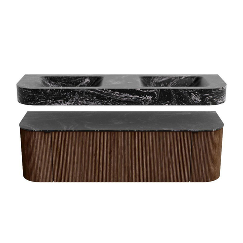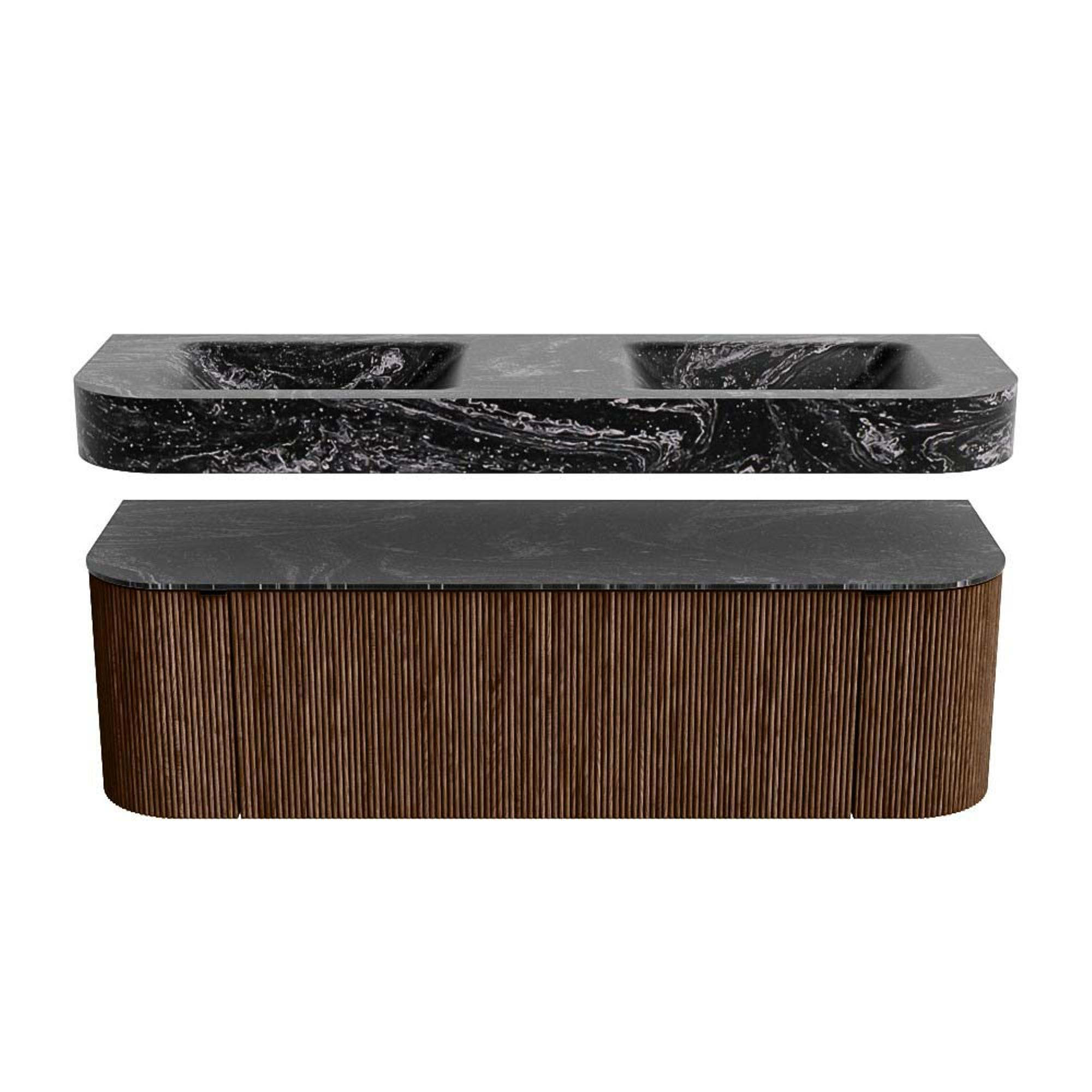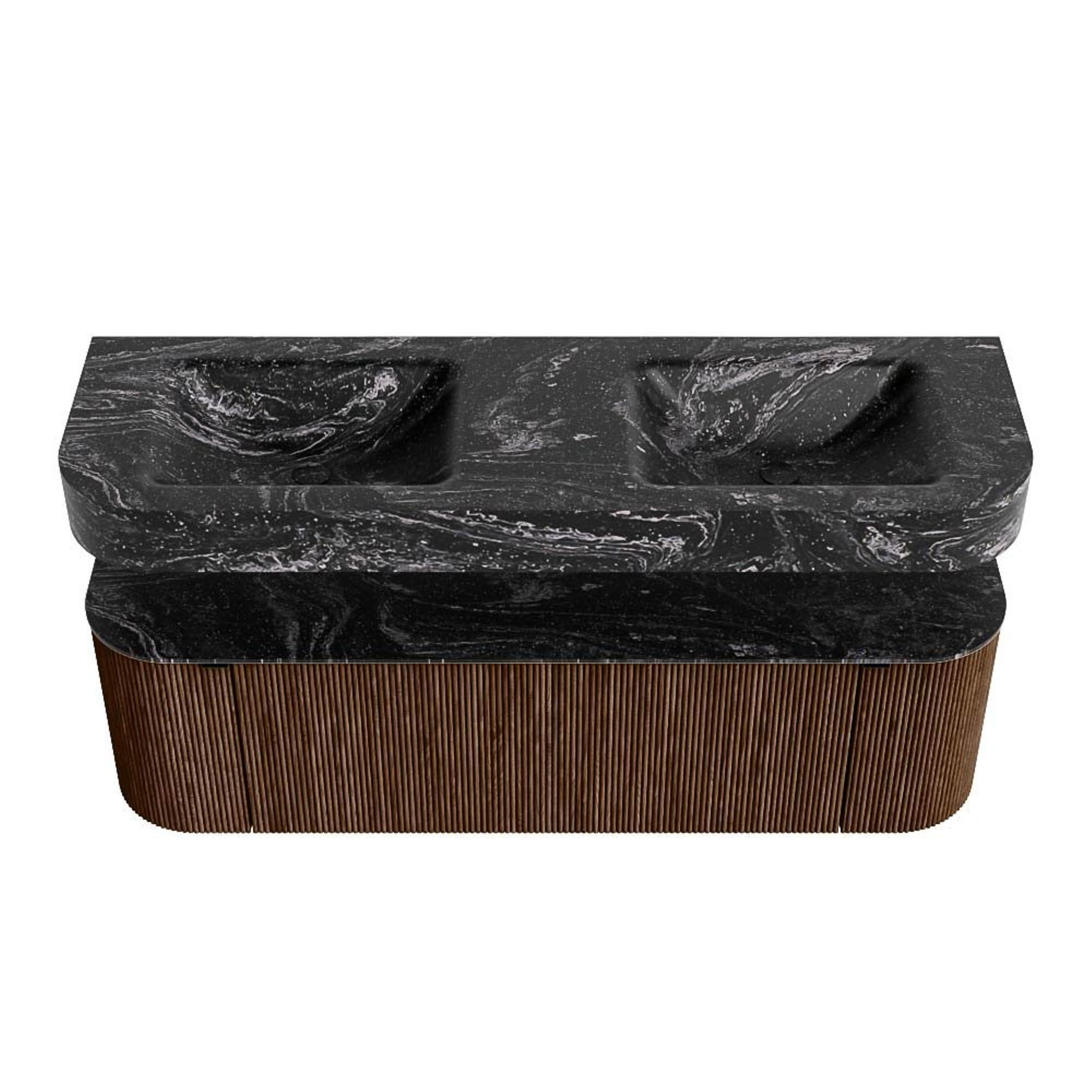 MONDIAZ THOR-DLUX 150cm badmeubel ronding links + rechts kleur Walnut met 1 lade en 2 deuren. Vrijhangende wastafel CLOUD Dubbel zonder kraangat kleur Lava.