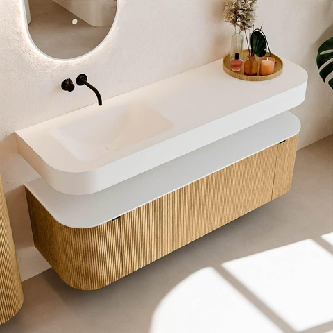 Boven het meubel zweeft een bijpassende, vrij hangende wastafel met afgeronde hoeken – perfect afgestemd op de vorm van de kast. De wastafel is uitgevoerd in Solid Surface en volgt subtiel de lijnen van het onderliggende meubel, waardoor een harmonieus geheel ontstaat. Het Solid Surface topblad vormt een sterke, onderhoudsvriendelijke basis en maakt de combinatie compleet.