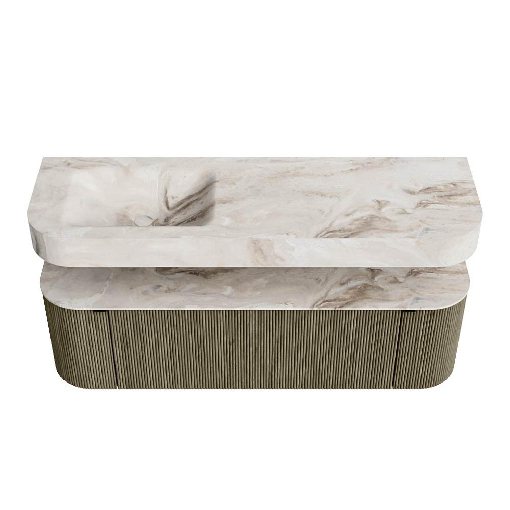 Boven het meubel zweeft een bijpassende, vrij hangende wastafel met afgeronde hoeken – perfect afgestemd op de vorm van de kast. De wastafel is uitgevoerd in Solid Surface en volgt subtiel de lijnen van het onderliggende meubel, waardoor een harmonieus geheel ontstaat. Het Solid Surface topblad vormt een sterke, onderhoudsvriendelijke basis en maakt de combinatie compleet.