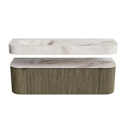 MONDIAZ THOR-DLUX 150cm badmeubel ronding links + rechts kleur Shadow met 1 lade en 2 deuren. Vrijhangende wastafel CLOUD Links zonder kraangat kleur Frappe.