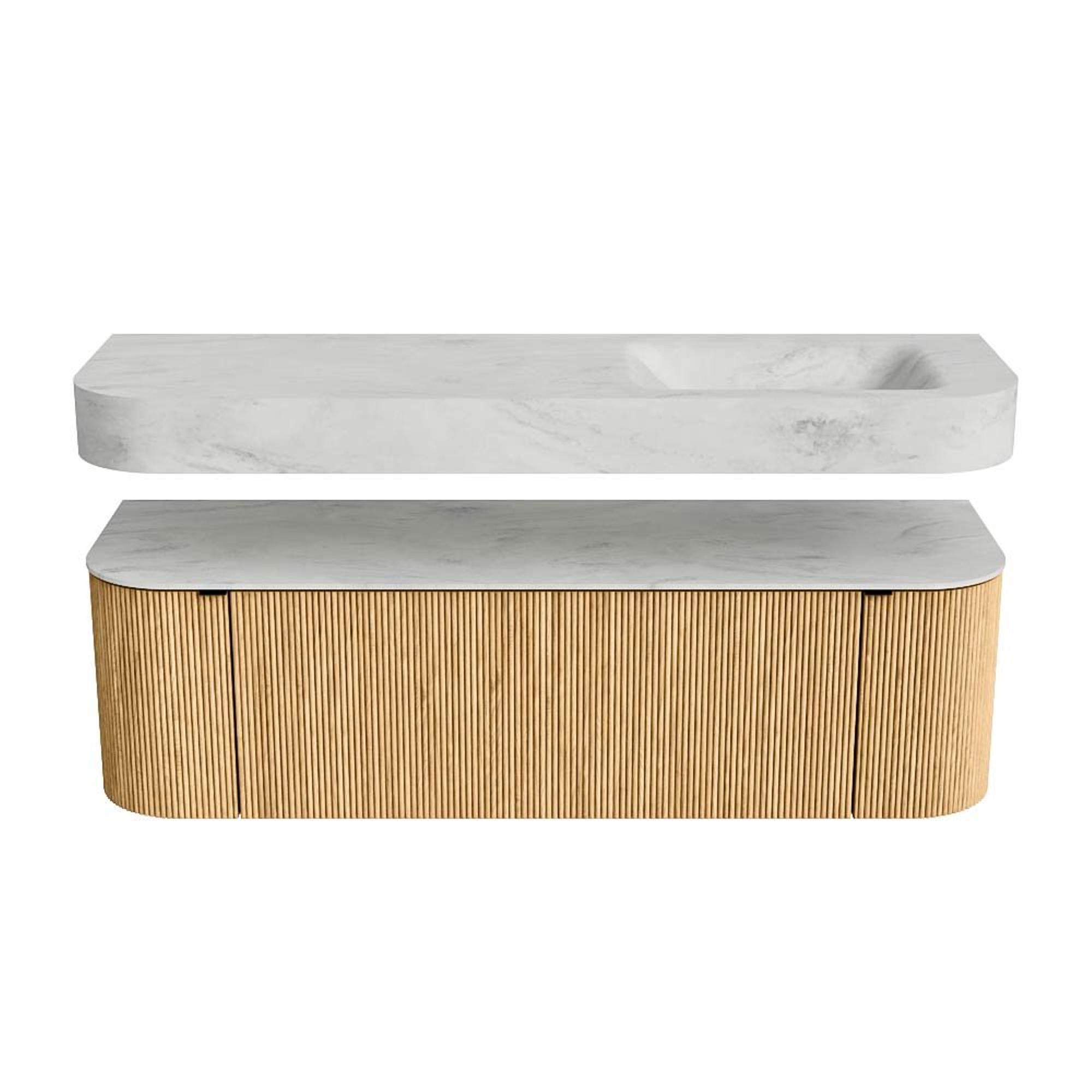 MONDIAZ THOR-DLUX 150cm badmeubel ronding links + rechts kleur Oak met 1 lade en 2 deuren. Vrijhangende wastafel CLOUD Rechts 1 kraangat kleur Opalo.