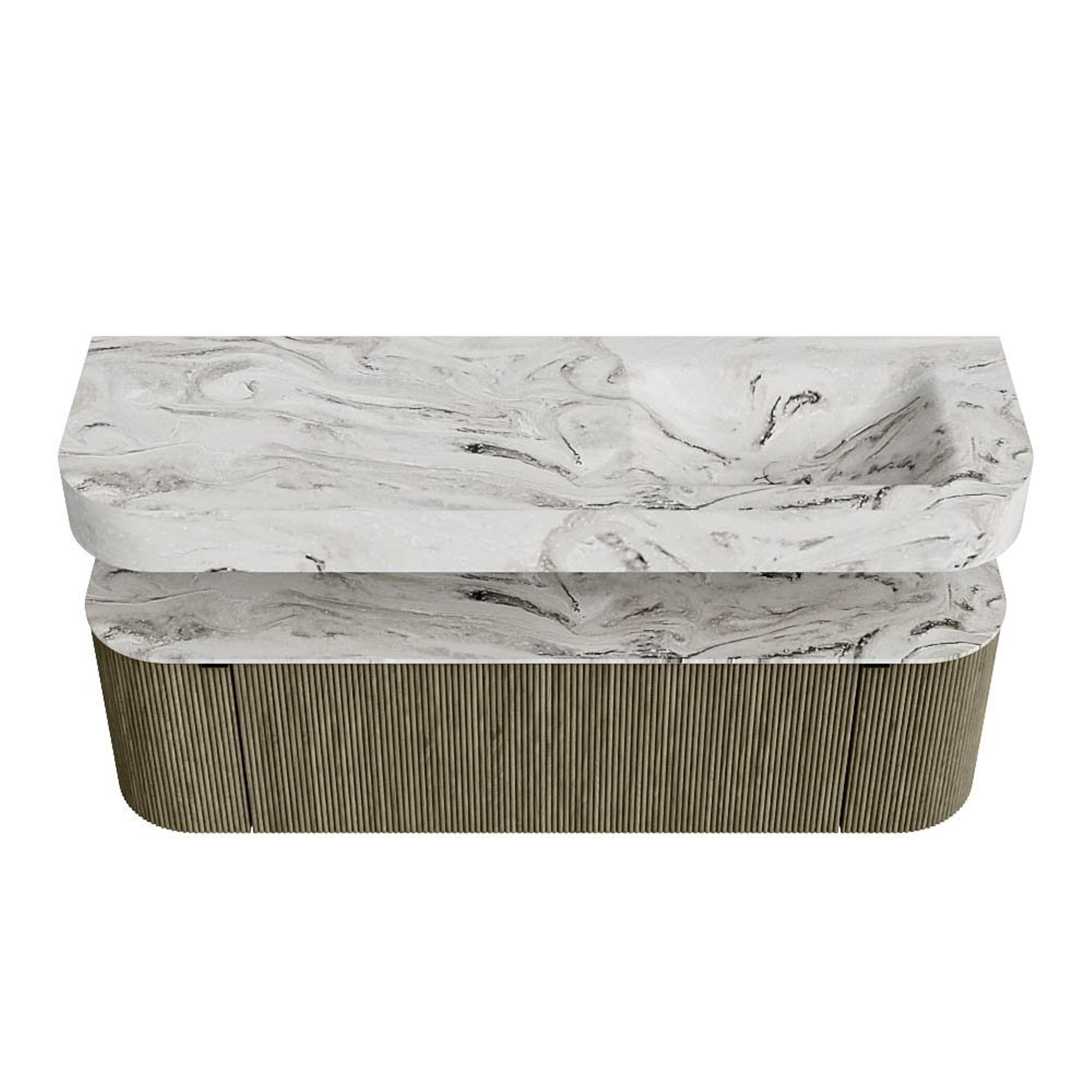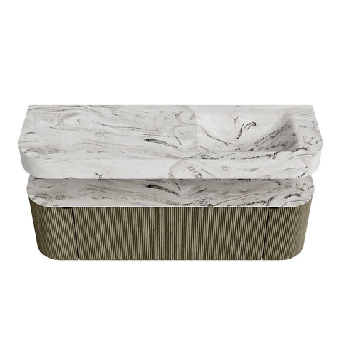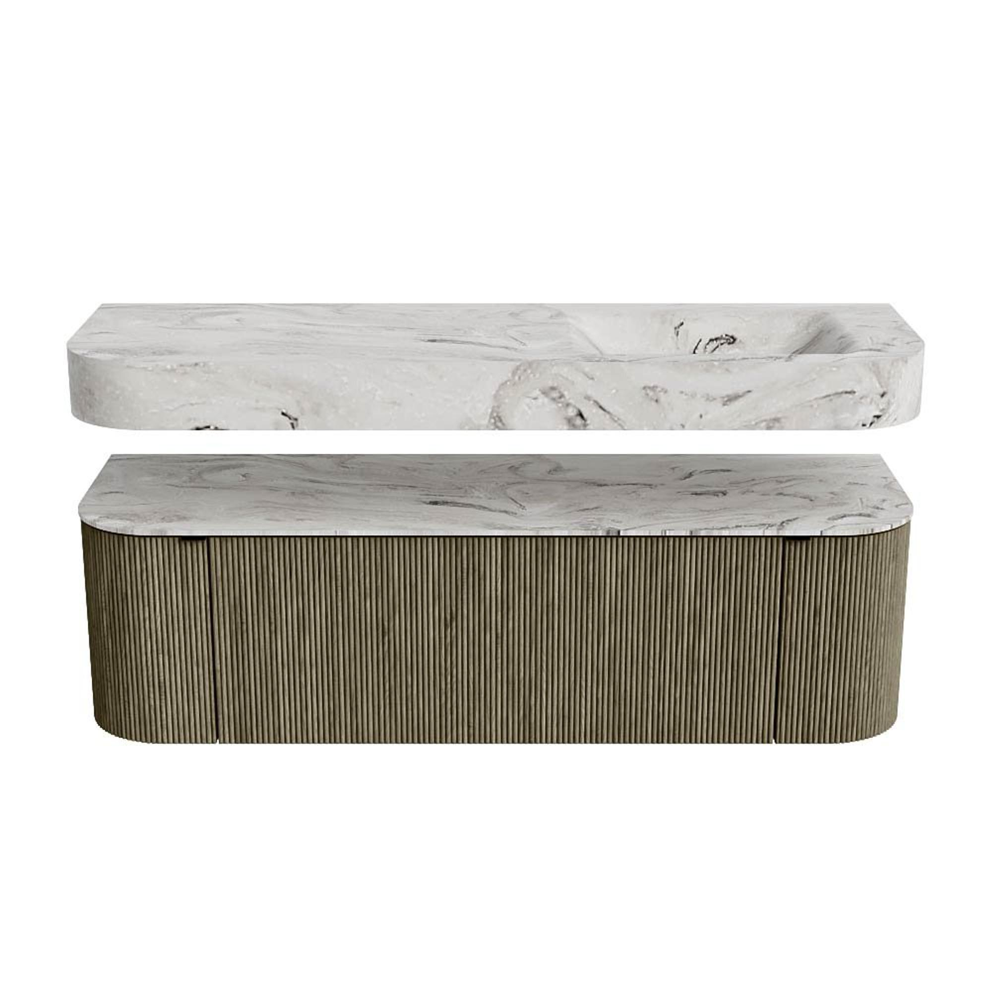 MONDIAZ THOR-DLUX 150cm badmeubel ronding links + rechts kleur Shadow met 1 lade en 2 deuren. Vrijhangende wastafel CLOUD Rechts 1 kraangat kleur Glace.
