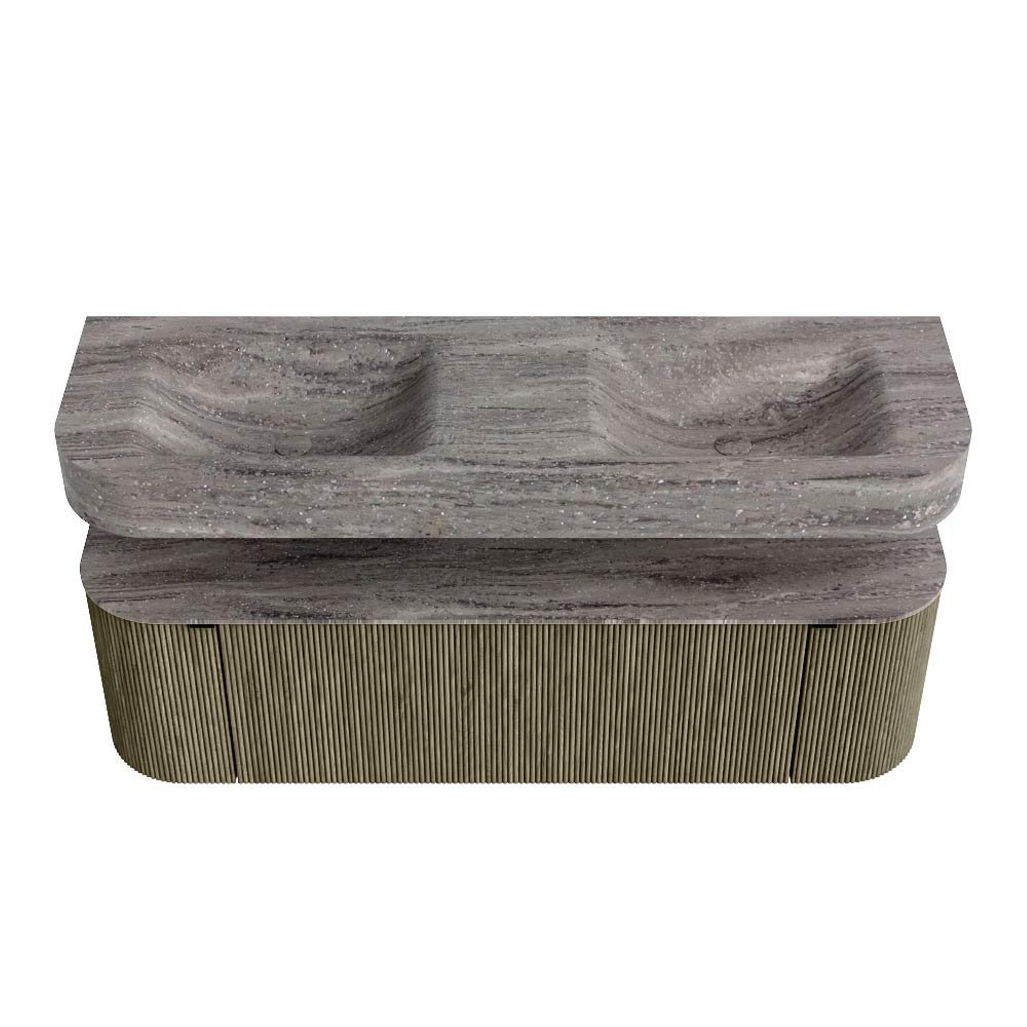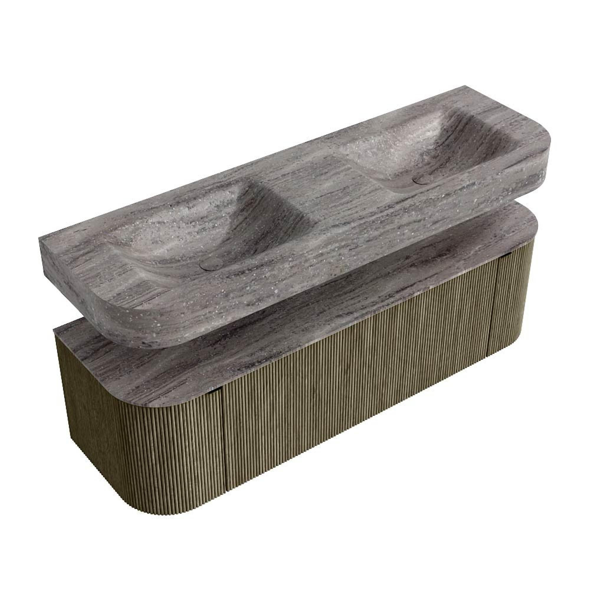 MONDIAZ THOR-DLUX 150cm badmeubel ronding links + rechts kleur Shadow met 1 lade en 2 deuren. Vrijhangende wastafel CLOUD Dubbel zonder kraangat kleur Oza.