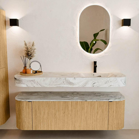 Boven het meubel zweeft een bijpassende, vrij hangende wastafel met afgeronde hoeken – perfect afgestemd op de vorm van de kast. De wastafel is uitgevoerd in Solid Surface en volgt subtiel de lijnen van het onderliggende meubel, waardoor een harmonieus geheel ontstaat. Het Solid Surface topblad vormt een sterke, onderhoudsvriendelijke basis en maakt de combinatie compleet.